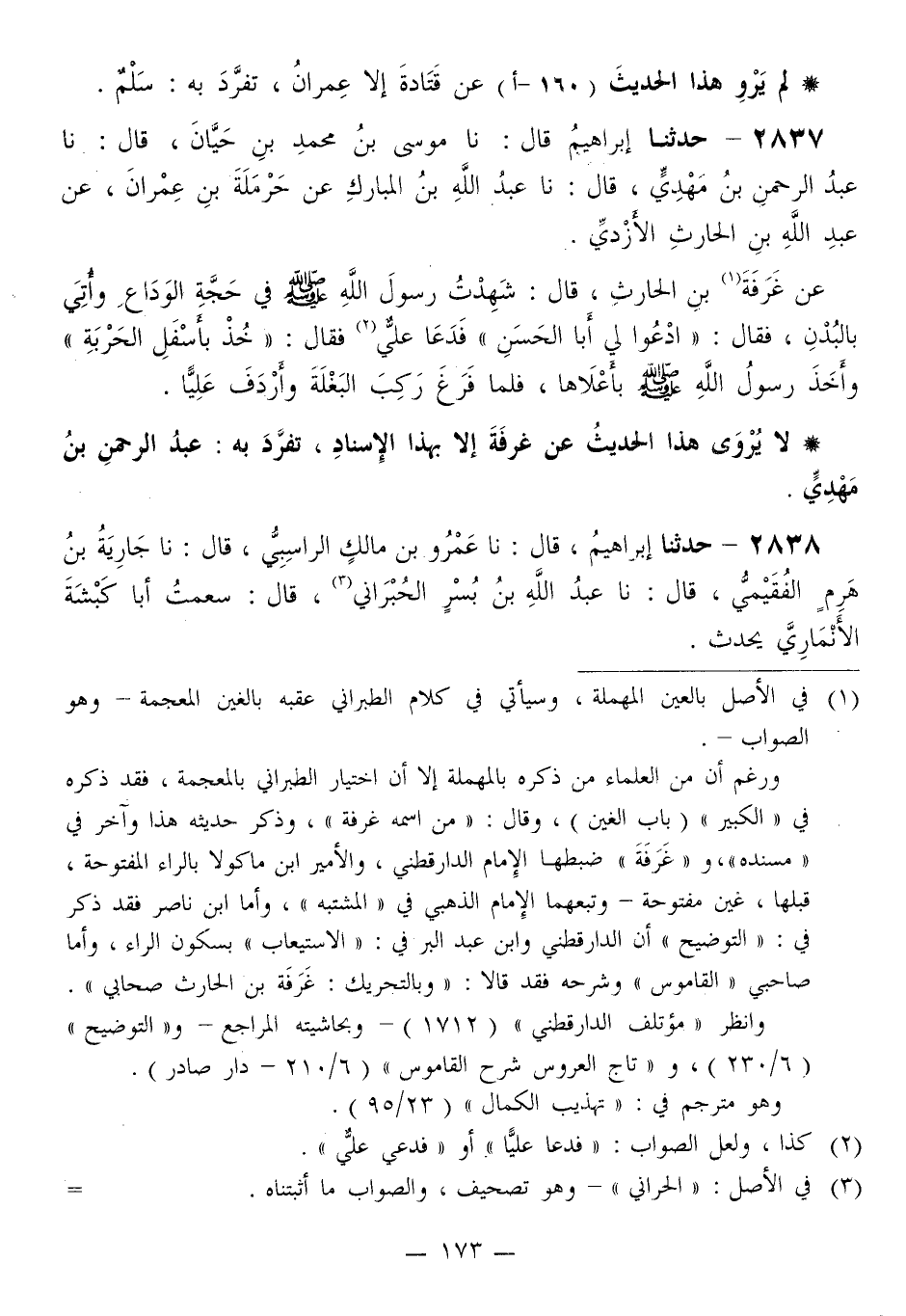 2837 - حَدَّثَنَا إِبْرَاهِيمُ قَالَ: نا مُوسَى بْنُ مُحَمَّدِ بْنِ حَيَّانَ قَالَ: نا عَبْدُ الرَّحْمَنِ بْنُ مَهْدِيٍّ قَالَ: نا عَبْدُ اللَّهِ بْنُ الْمُبَارَكِ، عَنْ حَرْمَلَةَ بْنِ عِمْرَانَ، عَنْ عَبْدِ اللَّهِ بْنِ الْحَارِثِ الْأَزْدِيِّ، عَنْ غَرْفَةَ بْنِ الْحَارِثِ قَالَ: شَهِدْتُ رَسُولَ اللَّهِ صَلَّى اللهُ عَلَيْهِ وَسَلَّمَ فِي حِجَّةِ الْوَدَاعِ وَأُتِيَ بِالْبُدْنِ، فَقَالَ: «§ادْعُوا لِي أَبَا الْحَسَنِ» فَدَعَا عَلِيًّا فَقَالَ: «خُذْ بِأَسْفَلِ الْحَرْبَةِ» وَأَخَذَ رَسُولُ اللَّهِ صَلَّى اللهُ عَلَيْهِ وَسَلَّمَ بِأَعْلَاهَا، فَلَمَّا فَرَغَ رَكِبَ الْبَغْلَةَ وَأَرْدَفَ عَلِيًّا لَا يُرْوَى هَذَا الْحَدِيثُ عَنْ غَرْفَةَ إِلَّا بِهَذَا الْإِسْنَادِ، تَفَرَّدَ بِهِ عَبْدُ الرَّحْمَنِ بْنُ مَهْدِيٍّ