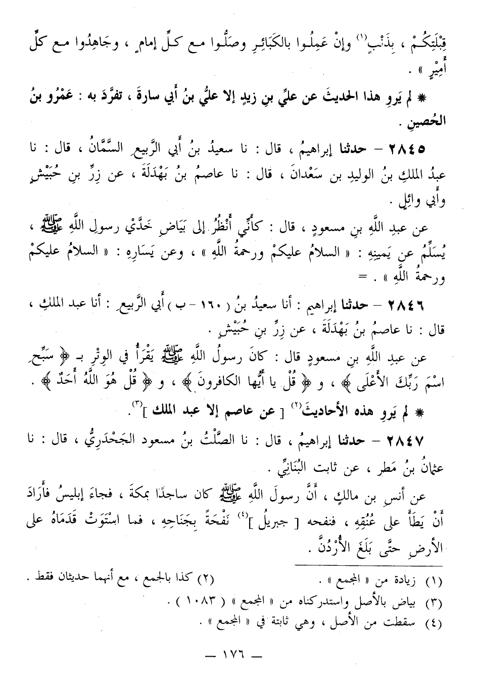 2845 - حَدَّثَنَا إِبْرَاهِيمُ قَالَ: نا سَعِيدُ بْنُ أَبِي الرَّبِيعِ السَّمَّانُ قَالَ: نا عَبْدُ الْمَلِكِ بْنُ الْوَلِيدِ بْنِ سَعْدَانَ قَالَ: نا عَاصِمُ ابْنُ بَهْدَلَةَ، عَنْ زِرِّ بْنِ حُبَيْشٍ، وَأَبِي وَائِلٍ، عَنْ عَبْدِ اللَّهِ بْنِ مَسْعُودٍ قَالَ: كَأَنِّي أَنْظُرُ إِلَى بَيَاضِ خَدَّيْ رَسُولِ اللَّهِ صَلَّى اللهُ عَلَيْهِ وَسَلَّمَ يُسَلِّمُ عَنْ يَمِينِهِ: «§السَّلَامُ عَلَيْكُمْ وَرَحْمَةُ اللَّهِ» ، وَعَنْ يَسَارِهِ: «السَّلَامُ عَلَيْكُمْ وَرَحْمَةُ اللَّهِ»