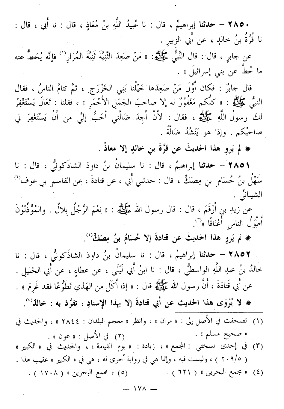 2850 - حَدَّثَنَا إِبْرَاهِيمُ قَالَ: نا عُبَيْدُ اللَّهِ بْنُ مُعَاذٍ قَالَ: نا أَبِي قَالَ: نا قُرَّةُ بْنُ خَالِدٍ، عَنْ أَبِي الزُّبَيْرِ، عَنْ جَابِرٍ قَالَ: قَالَ النَّبِيُّ صَلَّى اللهُ عَلَيْهِ وَسَلَّمَ: «§مَنْ صَعِدَ الثَّنِيَّةَ ثَنِيَّةَ الْمُرَارِ فَإِنَّهُ يُحَطُّ عَنْهُ مَا حُطَّ عَنْ بَنِي إِسْرَائِيلَ» . قَالَ جَابِرٌ: فَكَانَ أَوَّلَ مَنْ صَعِدَهَا خَيْلُنَا بَنِي الْخَزْرَجِ، ثُمَّ تَتَامَّ النَّاسُ، فَقَالَ النَّبِيُّ صَلَّى اللهُ عَلَيْهِ وَسَلَّمَ: «كُلُّكُمْ مَغْفُورٌ لَهُ إِلَّا صَاحِبَ الْجَمَلِ الْأَحْمَرِ» ، فَقُلْنَا: تَعَالَ يَسْتَغْفِرْ لَكَ رَسُولُ اللَّهِ صَلَّى اللهُ عَلَيْهِ وَسَلَّمَ فَقَالَ: لَأَنْ أَجِدَ ضَالَّتِي أَحَبُّ إِلَيَّ مِنْ أَنْ يَسْتَغْفِرَ لِي صَاحِبُكُمْ، وَإِذَا هُوَ يُنْشِدُ ضَالَّةً لَمْ يَرْوِ هَذَا الْحَدِيثَ عَنْ قُرَّةَ بْنِ خَالِدٍ إِلَّا مُعَاذُ