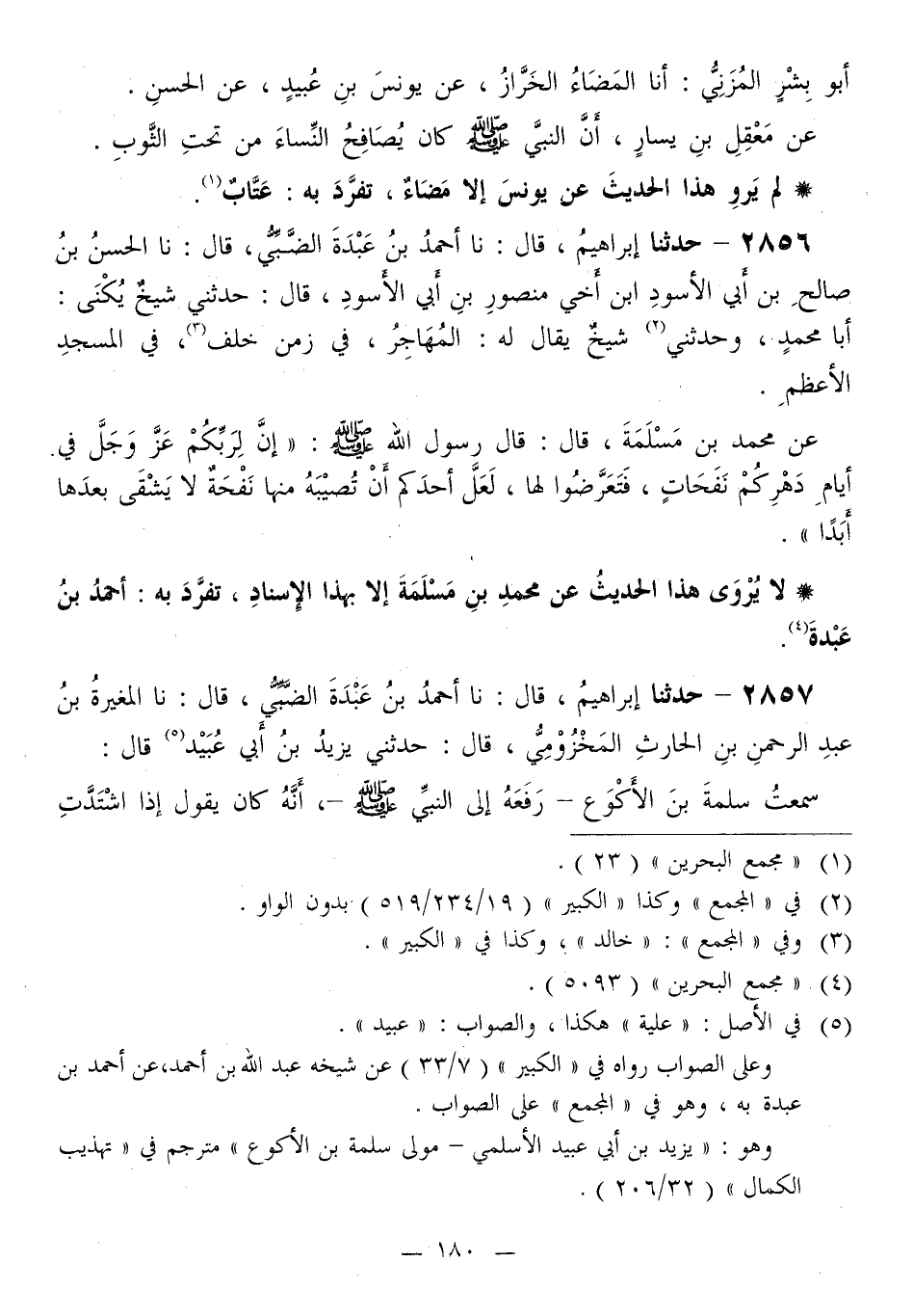 2856 - حَدَّثَنَا إِبْرَاهِيمُ قَالَ: نا أَحْمَدُ بْنُ عَبْدَةَ الضَّبِّيُّ قَالَ: نا الْحَسَنُ بْنُ صَالِحِ بْنِ أَبِي الْأَسْوَدِ ابْنِ أَخِي مَنْصُورِ بْنِ أَبِي الْأَسْوَدِ قَالَ: حَدَّثَنِي شَيْخٌ يُكَنَّى: أَبَا مُحَمَّدٍ، وَحَدَّثَنِي شَيْخٌ يُقَالُ لَهُ الْمُهَاجِرُ، فِي زَمَنِ خَلَفٍ فِي الْمَسْجِدِ الْأَعْظَمِ، عَنْ مُحَمَّدِ بْنِ مَسْلَمَةَ قَالَ: قَالَ رَسُولُ اللَّهِ صَلَّى اللهُ عَلَيْهِ وَسَلَّمَ: «إِنَّ §لِرَبِّكُمْ عَزَّ وَجَلَّ فِي أَيَّامِ دَهْرِكُمْ نَفَحَاتٍ، فَتَعَرَّضُوا لَهَا، لَعَلَّ أَحَدَكُمْ أَنْ تُصِيبَهُ مِنْهَا نَفْحَةٌ لَا يَشْقَى بَعْدَهَا أَبَدًا»