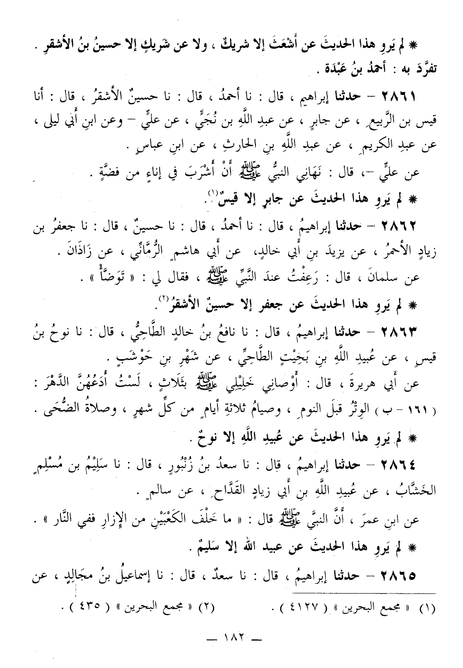 2861 - حَدَّثَنَا إِبْرَاهِيمُ قَالَ: نا أَحْمَدُ قَالَ: نا حُسَيْنٌ الْأَشْقَرُ قَالَ: أَنَا قَيْسُ بْنُ الرَّبِيعِ، عَنْ جَابِرٍ، عَنْ عَبْدِ اللَّهِ بْنِ نَجِيٍّ، عَنْ عَلِيٍّ، وَعَنِ ابْنِ أَبِي لَيْلَى، عَنْ عَبْدِ الْكَرِيمِ، عَنْ عَبْدِ اللَّهِ بْنِ الْحَارِثِ، عَنِ ابْنِ عَبَّاسٍ، عَنْ عَلِيٍّ قَالَ: «§نَهَانِي النَّبِيُّ صَلَّى اللهُ عَلَيْهِ وَسَلَّمَ أَنْ أَشْرَبَ فِي إِنَاءٍ مِنْ فِضَّةٍ»