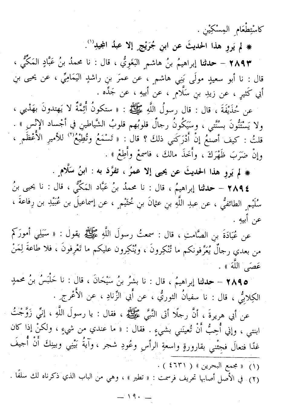 2893 - حَدَّثَنَا إِبْرَاهِيمُ بْنُ هَاشِمٍ الْبَغَوِيُّ قَالَ: نا مُحَمَّدُ بْنُ عَبَّادٍ الْمَكِّيُّ قَالَ: نا أَبُو سَعِيدٍ، مَوْلَى بَنِي هَاشِمٍ، عَنْ عُمَرَ بْنِ رَاشِدٍ الْيَمَامِيِّ، عَنْ يَحْيَى بْنِ أَبِي كَثِيرٍ، عَنْ زَيْدِ بْنِ سَلَّامٍ، عَنْ أَبِيهِ، عَنْ جَدِّهِ، عَنْ حُذَيْفَةَ قَالَ: قَالَ رَسُولُ اللَّهِ صَلَّى اللهُ عَلَيْهِ وَسَلَّمَ: «§سَتَكُونُ أَئِمَّةٌ لَا يَهْتَدُونَ بِهَدْيِي، وَلَا يَسْتَنُّونَ بِسُنَّتِي، وَسَتَكُونُ رِجَالٌ قُلُوبُهُمْ قُلُوبُ الشَّيَاطِينِ فِي أَجْسَادِ الْإِنْسِ» قُلْتُ: كَيْفَ أَصْنَعُ إِنْ أَدْرَكَنِي ذَلِكَ؟ قَالَ: «تَسْمَعُ وَتُطِيعُ لِلْأَمِيرِ الْأَعْظَمِ، وَإِنْ ضَرَبَ ظَهْرَكَ، وَأَخَذَ مَالَكَ، فَاسْمَعْ وَأَطِعْ»
