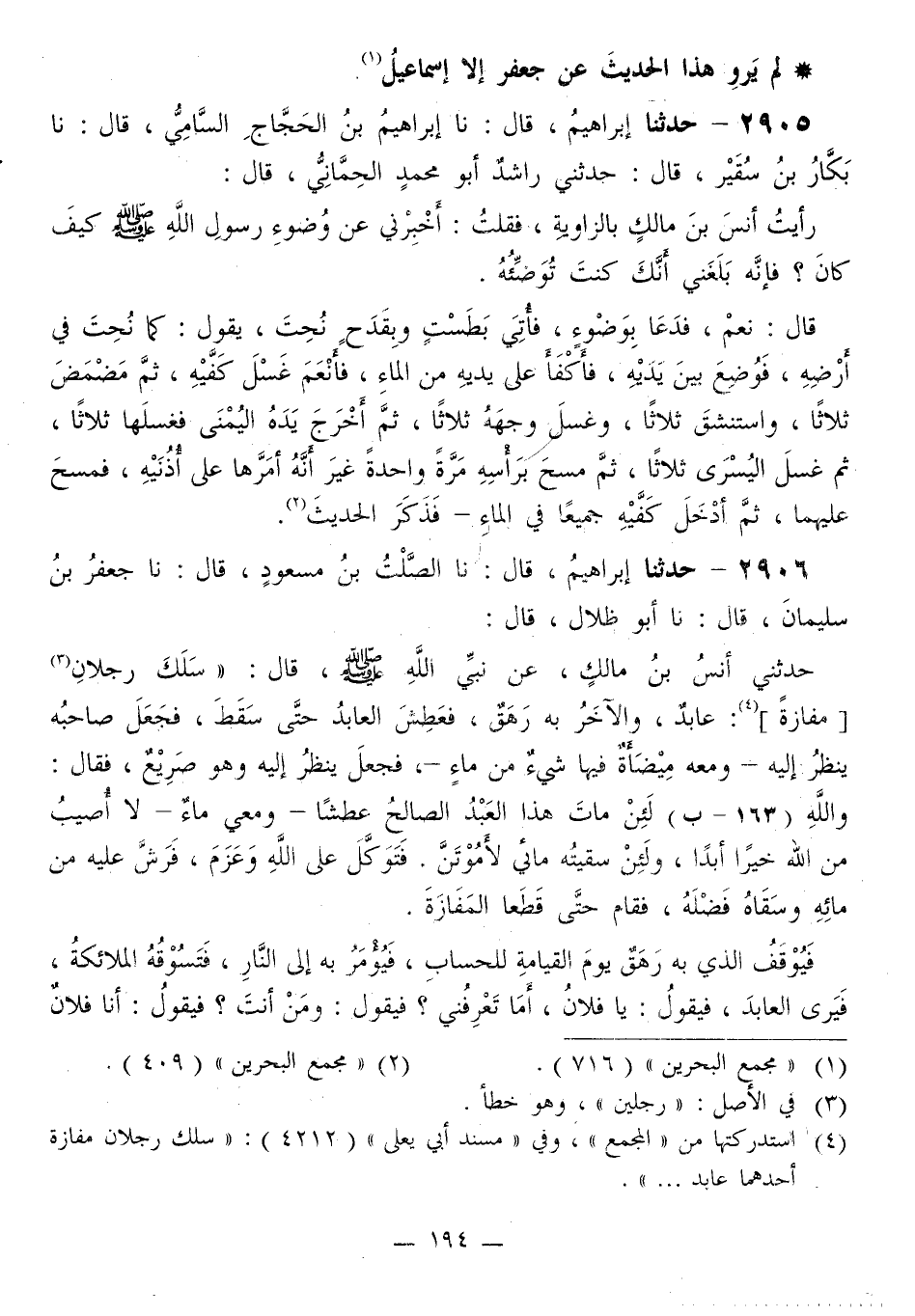 2905 - حَدَّثَنَا إِبْرَاهِيمُ قَالَ: نا إِبْرَاهِيمُ بْنُ الْحَجَّاجِ السَّامِيُّ قَالَ: نا بَكَّارُ بْنُ سُقَيْرٍ قَالَ: حَدَّثَنِي رَاشِدٌ أَبُو مُحَمَّدٍ الْحِمَّانِيُّ قَالَ: رَأَيْتُ أَنَسَ بْنَ مَالِكٍ، بِالزَّاوِيَةِ، فَقُلْتُ: أَخْبِرْنِي عَنْ وُضُوءِ رَسُولِ اللَّهِ صَلَّى اللهُ عَلَيْهِ وَسَلَّمَ كَيْفَ كَانَ؟ فَإِنَّهُ بَلَغَنِي أَنَّكَ كُنْتَ تُوَضِّئُهُ قَالَ: «نَعَمْ» ، فَدَعَا بِوَضُوءٍ، فَأُتِيَ بِطَسْتٍ وبِقَدَحٍ نُحِتَ، يَقُولُ: كَمَا نُحِتَ فِي أَرْضِهِ فَوُضِعَ بَيْنَ يَدَيْهِ، §فَأَكْفَأَ عَلَى يَدَيْهِ مِنَ الْمَاءِ، فَأَنْعَمَ غُسْلَ كَفَّيْهِ، ثُمَّ مَضْمَضَ ثَلَاثًا، وَاسْتَنْشَقَ ثَلَاثًا، وَغَسَلَ وَجْهَهُ ثَلَاثًا، ثُمَّ أَخْرَجَ يَدَهُ الْيُمْنَى فَغَسَلَهَا ثَلَاثًا، ثُمَّ غَسَلَ الْيُسْرَى ثَلَاثًا، ثُمَّ مَسَحَ بِرَأْسِهِ مَرَّةً وَاحِدَةً غَيْرَ أَنَّهُ أَمَرَّهَا عَلَى أُذُنَيْهِ، فَمَسَحَ عَلَيْهِمَا، ثُمَّ أَدْخَلَ كَفَّيْهِ جَمِيعًا فِي الْمَاءِ فَذَكَرَ الْحَدِيثَ