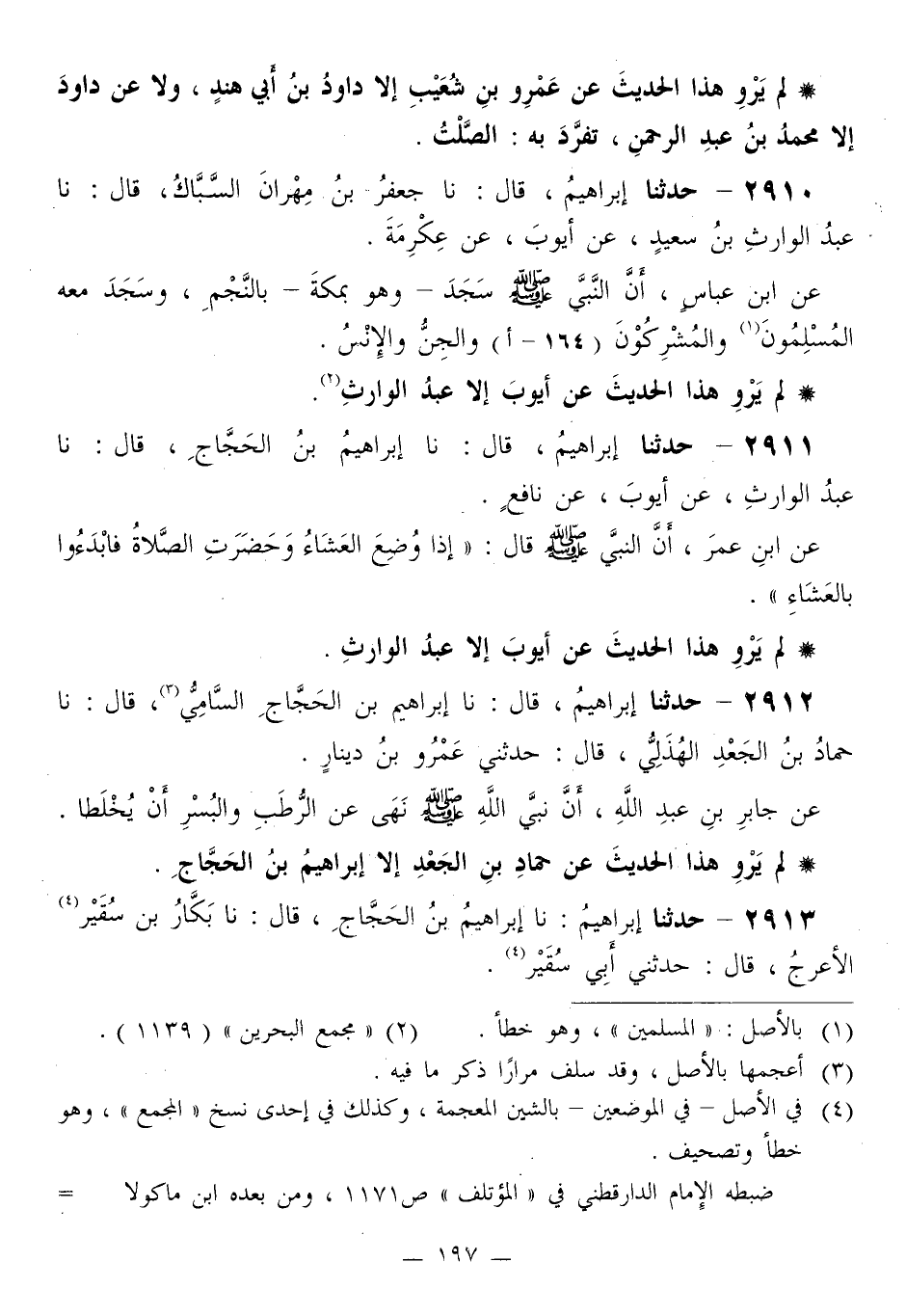 2910 - حَدَّثَنَا إِبْرَاهِيمُ قَالَ: نا جَعْفَرُ بْنُ مِهْرَانَ السَّبَّاكُ قَالَ: نا عَبْدُ الْوارِثِ بْنُ سَعِيدٍ، عَنْ أَيُّوبَ، عَنْ عِكْرِمَةَ، عَنِ ابْنِ عَبَّاسٍ «أَنَّ النَّبِيَّ صَلَّى اللهُ عَلَيْهِ وَسَلَّمَ §سَجَدَ، وَهُوَ بِمَكَّةَ، بِالنَّجْمِ، وَسَجَدَ مَعَهُ الْمُسْلِمُونَ وَالْمُشْرِكُونَ وَالْجِنُّ وَالْإِنْسُ»