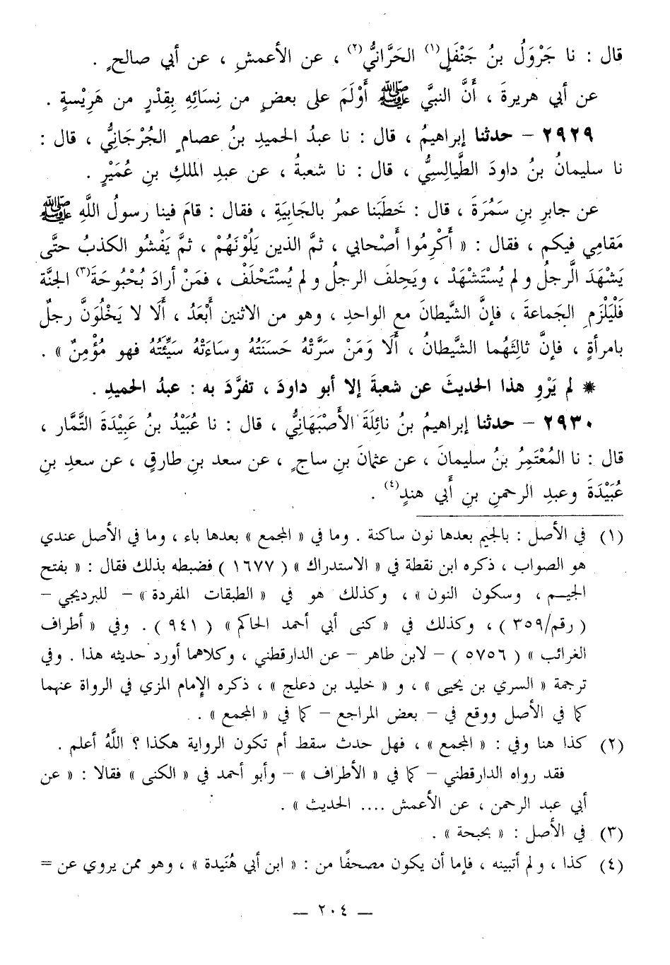 2929 - حَدَّثَنَا إِبْرَاهِيمُ قَالَ: نا عَبْدُ الْحَمِيدِ بْنُ عِصَامٍ الْجُرْجَانِيُّ قَالَ: نا سُلَيْمَانُ بْنُ دَاوُدَ الطَّيَالِسِيُّ قَالَ: نا شُعْبَةُ، عَنْ عَبْدِ الْمَلِكِ بْنِ عُمَيْرٍ، عَنْ جَابِرِ بْنِ سَمُرَةَ قَالَ: خَطَبَنَا عُمَرُ بِالْجَابِيَةِ، فَقَالَ: قَامَ فِينَا رَسُولُ اللَّهِ صَلَّى اللهُ عَلَيْهِ وَسَلَّمَ مَقَامِي فِيكُمْ، فَقَالَ: «§أَكْرِمُوا أَصْحَابِي، ثُمَّ الَّذِينَ يَلُونَهُمْ، ثُمَّ يَفْشُو الْكَذِبُ حَتَّى يَشْهَدَ الرَّجُلُ وَلَمْ يُسْتَشْهَدْ، وَيَحْلِفَ الرَّجُلُ وَلَمْ يُسْتَحْلَفْ، فَمَنْ أَرَادَ بُحْبُوحَةَ الْجَنَّةِ فَلْيَلْزَمِ الْجَمَاعَةَ، فَإِنَّ الشَّيْطَانَ مَعَ الْوَاحِدِ، وَهُوَ مِنَ الِاثْنَيْنِ أَبْعَدُ، أَلَا لَا يَخْلُوَنَّ رَجُلٌ بِامْرَأَةٍ، فَإِنَّ ثَالِثَهُمَا الشَّيْطَانُ، أَلَا وَمَنْ سَرَّتْهُ حَسَّنْتُهُ، وَسَاءَتْهُ سَيِّئَتُهُ فَهُوَ مُؤْمِنٌ»