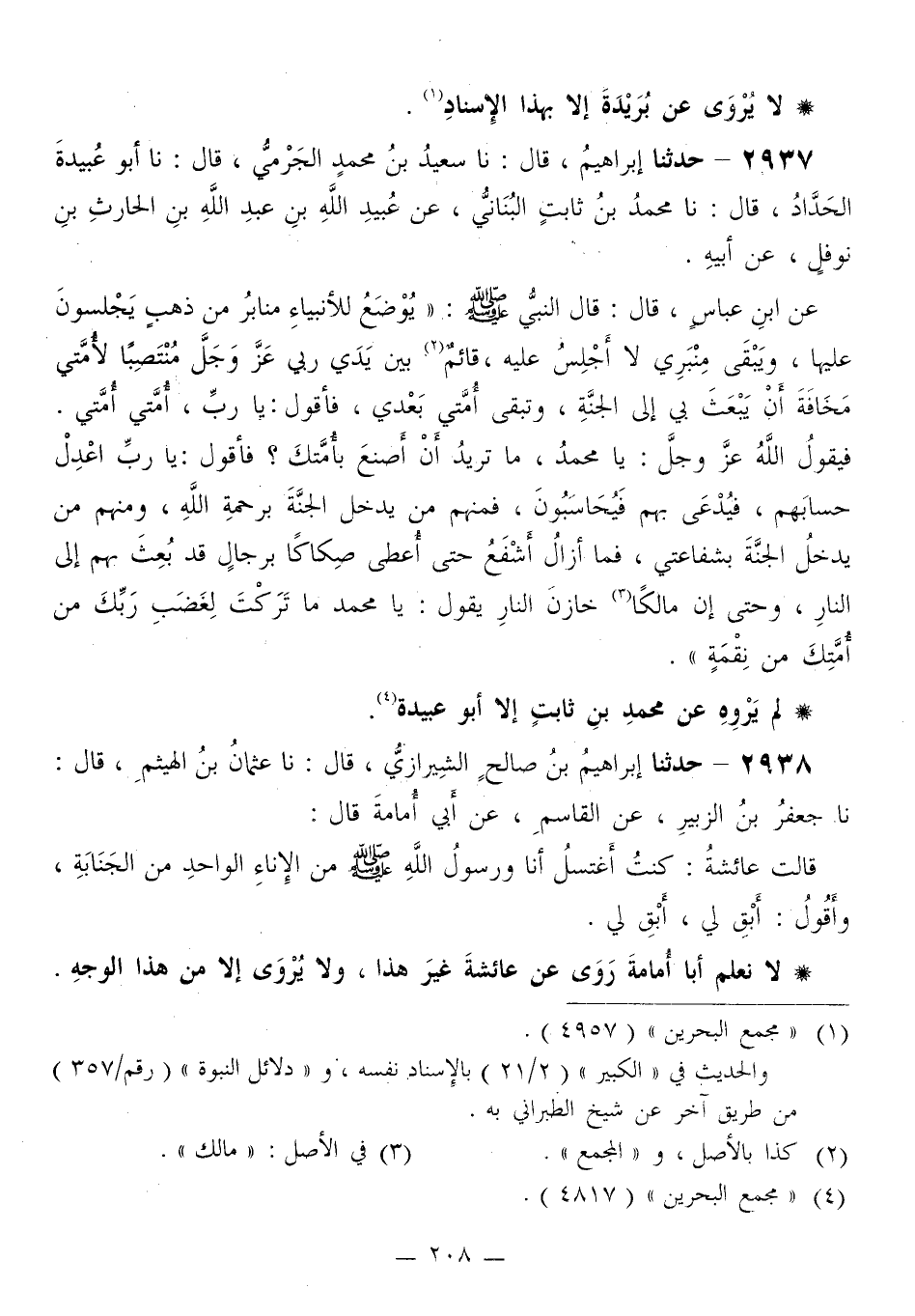 2937 - حَدَّثَنَا إِبْرَاهِيمُ قَالَ: نا سَعِيدُ بْنُ مُحَمَّدٍ الْجَرْمِيُّ قَالَ: نا أَبُو عُبَيْدَةَ الْحَدَّادُ قَالَ: نا مُحَمَّدُ بْنُ ثَابِتٍ الْبُنَانِيُّ، عَنْ عُبَيْدِ اللَّهِ بْنِ عَبْدِ اللَّهِ بْنِ الْحَارِثِ بْنِ نَوْفَلٍ، عَنْ أَبِيهِ، عَنِ ابْنِ عَبَّاسٍ قَالَ: قَالَ النَّبِيُّ صَلَّى اللهُ عَلَيْهِ وَسَلَّمَ: «يُوضَعُ لِلْأَنْبِيَاءِ مَنَابِرُ مِنْ ذَهَبٍ يَجْلِسُونَ عَلَيْهَا، وَيَبْقَى مِنْبَرِي لَا أَجْلِسُ عَلَيْهِ، قَائِمٌ بَيْنَ يَدَيْ رَبِّي عَزَّ وَجَلَّ مُنْتَصِبًا لِأُمَّتِي مَخَافَةَ أَنْ يَبْعَثَ بِي إِلَى الْجَنَّةِ، وَتَبْقَى أُمَّتِي بَعْدِي، فَأَقُولُ: يَا رَبِّ، أُمَّتِي أُمَّتِي. فَيَقُولُ اللَّهُ عَزَّ وَجَلَّ: §يَا مُحَمَّدُ، مَا تُرِيدُ أَنْ أَصْنَعَ بِأُمَّتِكَ؟ فَأَقُولُ: يَا رَبِّ اعْدِلْ حِسَابَهُمْ، فَيُدْعَى بِهِمْ فَيُحَاسَبُونَ، فَمِنْهُمْ مَنْ يَدْخُلُ الْجَنَّةَ بِرَحْمَةِ اللَّهِ، وَمِنْهُمْ مَنْ يَدْخُلُ الْجَنَّةَ بِشَفَاعَتِي فَمَا أَزَالُ أَشْفَعُ حَتَّى أُعْطَى صِكَاكًا بِرِجَالٍ قَدْ بُعِثَ بِهِمْ إِلَى النَّارِ، وَحَتَّى إِنَّ مَالِكًا خَازِنَ النَّارِ يَقُولُ: يَا مُحَمَّدُ مَا تَرَكْتَ لِغَضَبِ رَبِّكَ مِنْ أُمَّتِكَ مِنْ نِقْمَةٍ»