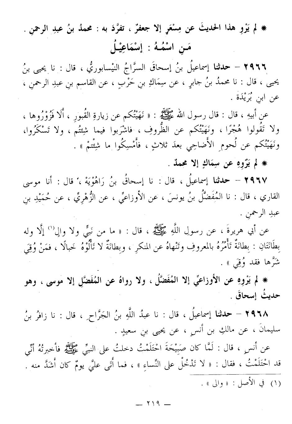 2968 - حَدَّثَنَا إِسْمَاعِيلُ قَالَ: نا عَبْدُ اللَّهِ بْنُ الْجَرَّاحِ قَالَ: نا زَافِرُ بْنُ سُلَيْمَانَ، عَنْ مَالِكِ بْنِ أَنَسٍ، عَنْ يَحْيَى بْنِ سَعِيدٍ، عَنْ أَنَسٍ قَالَ: لَمَّا كَانَ صَبِيحَةَ احْتَلَمْتُ دَخَلْتُ عَلَى النَّبِيِّ صَلَّى اللهُ عَلَيْهِ وَسَلَّمَ فَأَخْبَرْتُهُ أَنِّي قَدِ احْتَلَمْتُ، فَقَالَ: «§لَا تَدْخُلْ عَلَى النِّسَاءِ» ، فَمَا أَتَى عَلَيَّ يَوْمٌ كَانَ أَشَدَّ مِنْهُ لَمْ يَرْوِهِ عَنْ يَحْيَى إِلَّا مَالِكٌ، وَلَا عَنْ مَالِكٍ إِلَّا زَافِرٌ