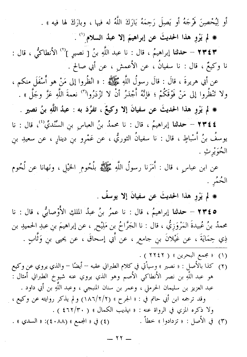 2343 - حَدَّثَنَا إِبْرَاهِيمُ قَالَ: نا عَبْدُ اللَّهِ بْنُ نُصَيْرٍ الْأَنْطَاكِيُّ قَالَ: نا وَكِيعٌ قَالَ: نا سُفْيَانُ، عَنِ الْأَعْمَشِ، عَنْ أَبِي صَالِحٍ، عَنْ أَبِي هُرَيْرَةَ قَالَ: قَالَ رَسُولُ اللَّهِ صَلَّى اللهُ عَلَيْهِ وَسَلَّمَ: «§انْظُرُوا إِلَى مَنْ هُوَ أَسْفَلَ مِنْكُمْ، وَلَا تَنْظُرُوا إِلَى مَنْ فَوْقَكُمْ، فَإِنَّهُ أَجْدَرُ أَنْ لَا تَزْدَرُوا نِعْمَةَ اللَّهِ عَزَّ وَجَلَّ»
