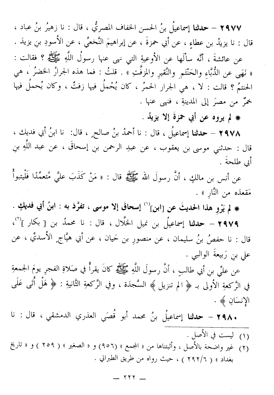 2978 - حَدَّثَنَا إِسْمَاعِيلُ قَالَ: نا أَحْمَدُ بْنُ صَالِحٍ قَالَ: نا ابْنُ أَبِي فُدَيْكٍ قَالَ: حَدَّثَنِي مُوسَى بْنُ يَعْقُوبَ، عَنْ عَبْدِ الرَّحْمَنِ بْنِ إِسْحَاقَ، عَنْ عَبْدِ اللَّهِ بْنِ أَبِي طَلْحَةَ، عَنْ أَنَسِ بْنِ مَالِكٍ، أَنَّ رَسُولَ اللَّهِ صَلَّى اللهُ عَلَيْهِ وَسَلَّمَ قَالَ: «§مَنْ كَذَبَ عَلَيَّ مُتَعَمِّدًا فَلْيَتَبَوَّأْ مَقْعَدَهُ مِنَ النَّارِ»