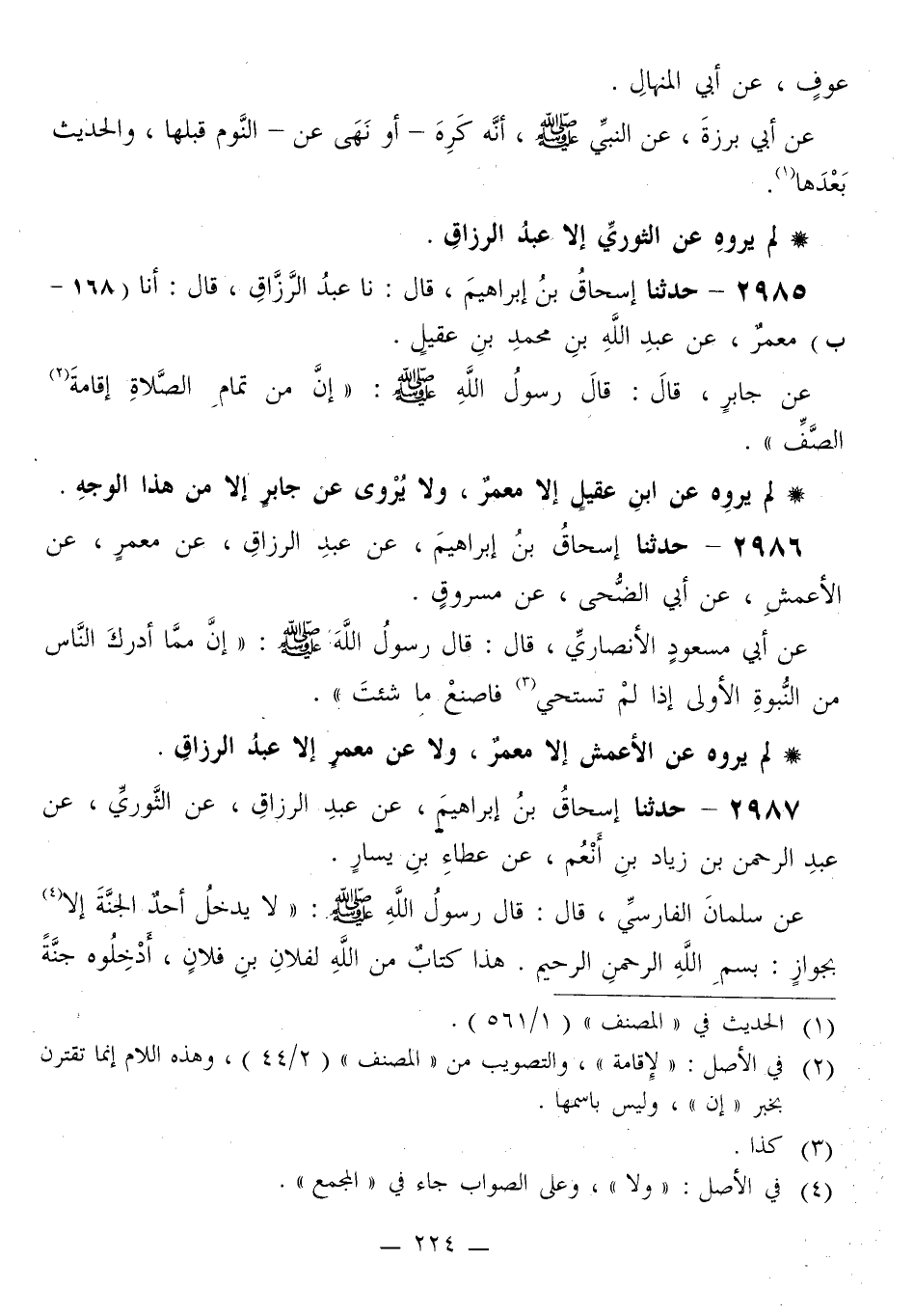 2987 - حَدَّثَنَا إِسْحَاقُ بْنُ إِبْرَاهِيمَ، عَنْ عَبْدِ الرَّزَّاقِ، عَنِ الثَّوْرِيِّ، عَنْ عَبْدِ الرَّحْمَنِ بْنِ زِيَادِ بْنِ أَنْعَمَ، عَنْ عَطَاءِ بْنِ يَسَارٍ، عَنْ سَلْمَانَ الْفَارِسِيِّ قَالَ: قَالَ رَسُولُ اللَّهِ صَلَّى اللهُ عَلَيْهِ وَسَلَّمَ: «§لَا يَدْخُلُ أَحَدٌ الْجَنَّةَ إِلَّا بِجَوَازِ: بِسْمِ اللَّهِ الرَّحْمَنِ الرَّحِيمِ، هَذَا كِتَابٌ مِنَ اللَّهِ لِفُلَانِ بْنِ فُلَانٍ، أَدْخِلُوهُ جَنَّةً -[225]- عَالِيَةً قُطُوفُهَا دَانِيَةٌ»