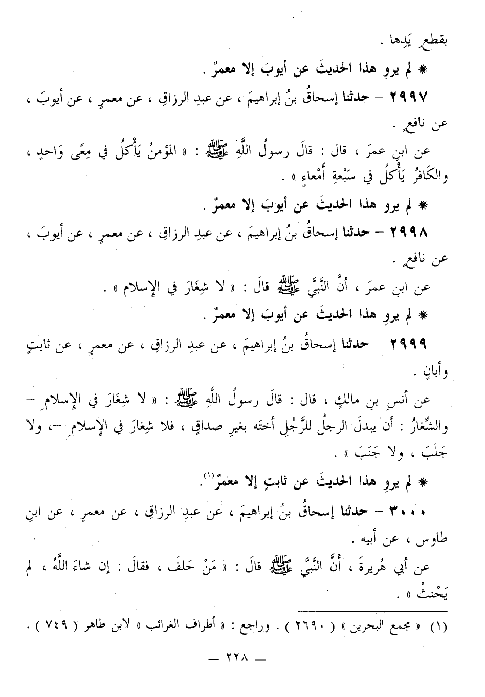 2998 - حَدَّثَنَا إِسْحَاقُ بْنُ إِبْرَاهِيمَ، عَنْ عَبْدِ الرَّزَّاقِ، عَنْ مَعْمَرٍ، عَنْ أَيُّوبَ، عَنْ نَافِعٍ، عَنِ ابْنِ عُمَرَ، أَنَّ النَّبِيَّ صَلَّى اللهُ عَلَيْهِ وَسَلَّمَ قَالَ: «§لَا شِغَارَ فِي الْإِسْلَامِ»