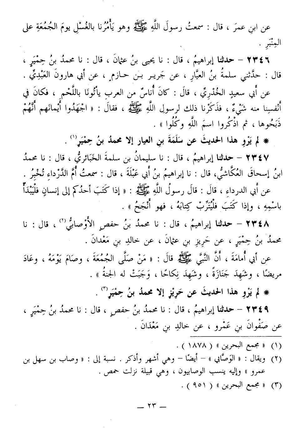 2346 - حَدَّثَنَا إِبْرَاهِيمُ قَالَ: نا يَحْيَى بْنُ عُثْمَانَ قَالَ: نَا مُحَمَّدُ بْنُ حِمْيَرَ قَالَ: حَدَّثَنِي سَلَمَةُ بْنُ الْعَيَّارِ، عَنْ جَرِيرِ بْنِ حَازِمٍ، عَنْ أَبِي هَارُونَ الْعَبْدِيِّ، عَنْ أَبِي سَعِيدٍ الْخُدْرِيِّ قَالَ: كَانَ أُنَاسٌ مِنَ الْعَرَبِ يَأْتُونَا بِاللَّحْمِ، فَكَانَ فِي أَنْفُسِنَا مِنْهُ شَيْءٌ، فَذَكَرْنَا ذَلِكَ لِرَسُولِ اللَّهِ صَلَّى اللهُ عَلَيْهِ وَسَلَّمَ فَقَالَ: «§أَجْهِدُوا أَيْمَانَهُمْ أَنَّهُمْ ذَبَحُوهَا، ثُمَّ اذْكُرُوا اسْمَ اللَّهِ وَكُلُوا»