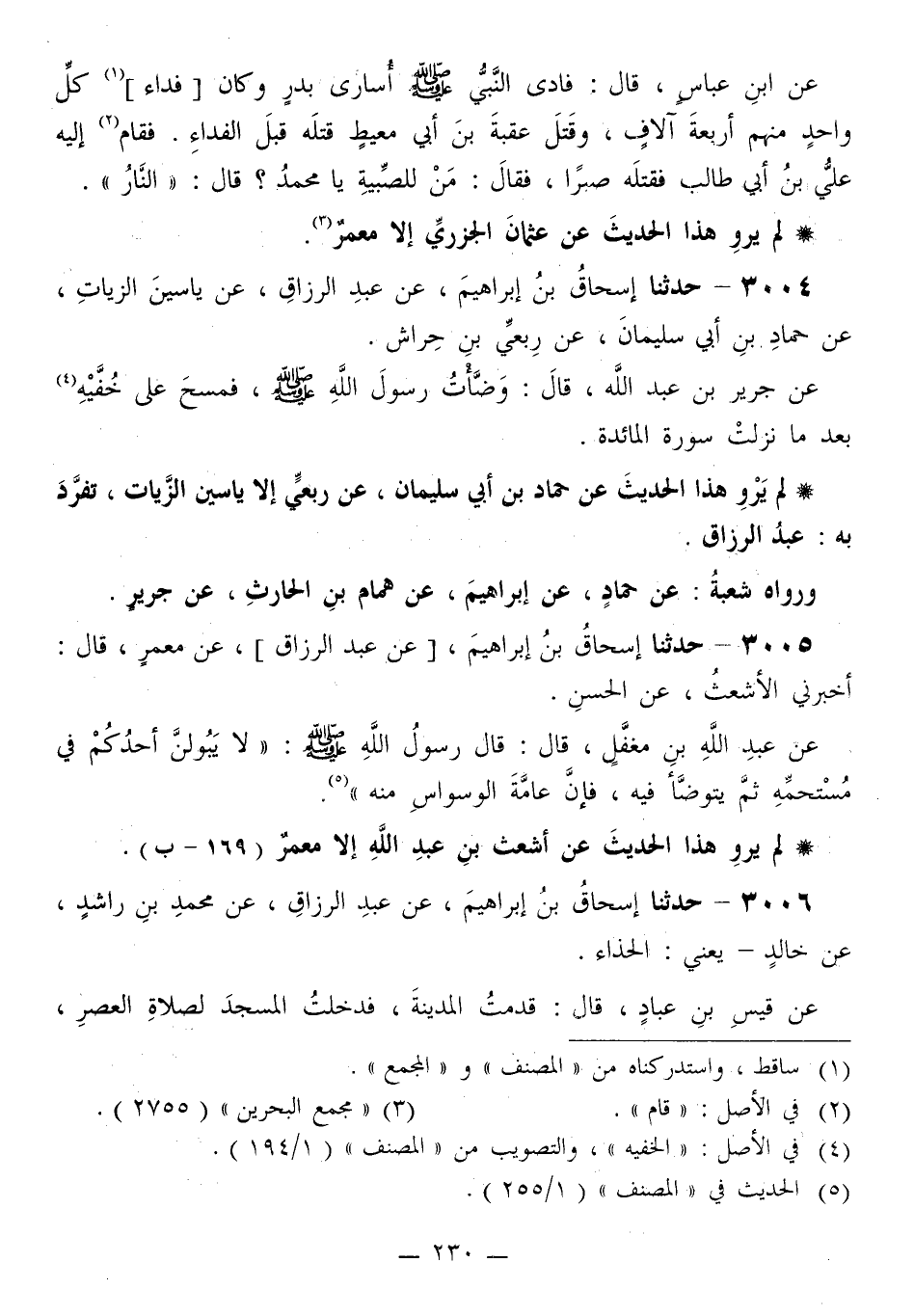 3004 - حَدَّثَنَا إِسْحَاقُ بْنُ إِبْرَاهِيمَ، عَنْ عَبْدِ الرَّزَّاقِ، عَنْ يَاسِينَ الزَّيَّاتِ، عَنْ حَمَّادِ بْنِ أَبِي سُلَيْمَانَ، عَنْ رِبْعِيِّ بْنِ حِرَاشٍ، عَنْ جَرِيرِ بْنِ عَبْدِ اللَّهِ قَالَ: وَضَّأْتُ رَسُولَ اللَّهِ صَلَّى اللهُ عَلَيْهِ وَسَلَّمَ §فَمَسَحَ عَلَى خُفَّيْهِ بَعْدَمَا نَزَلَتْ سُورَةُ الْمَائِدَةِ لَمْ يَرْوِ هَذَا الْحَدِيثَ عَنْ حَمَّادِ بْنِ أَبِي سُلَيْمَانَ، عَنْ رِبْعِيٍّ إِلَّا يَاسِينُ الزَّيَّاتُ، تَفَرَّدَ بِهِ عَبْدُ الرَّزَّاقِ وَرَوَاهُ شُعْبَةُ، عَنْ حَمَّادٍ، عَنْ إِبْرَاهِيمَ، عَنْ هَمَّامِ بْنِ الْحَارِثِ، عَنْ جَرِيرٍ
