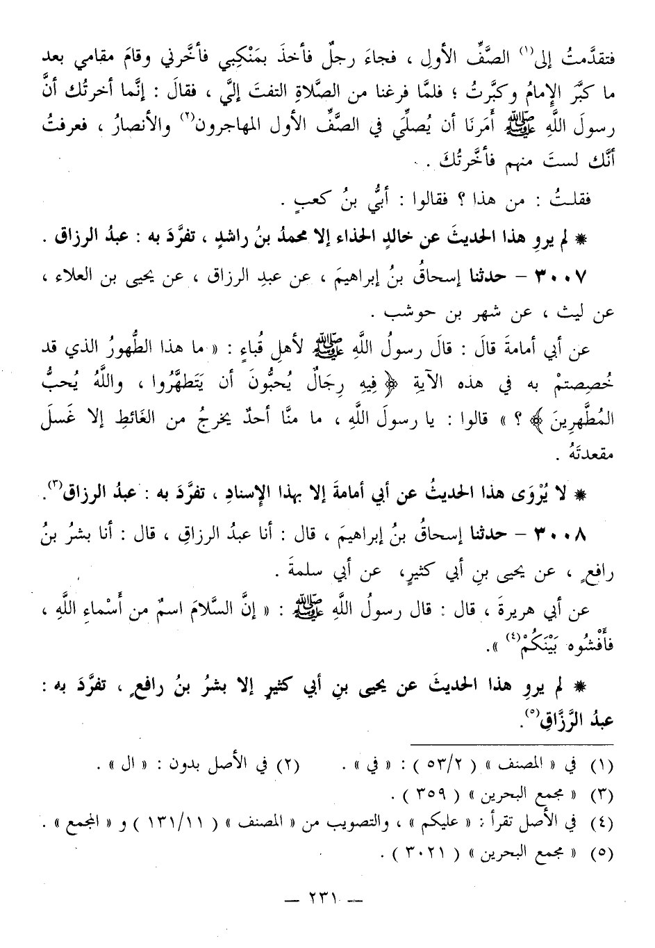3007 - حَدَّثَنَا إِسْحَاقُ بْنُ إِبْرَاهِيمَ، عَنْ عَبْدِ الرَّزَّاقِ، عَنْ يَحْيَى بْنِ الْعَلَاءِ، عَنْ لَيْثٍ، عَنْ شَهْرِ بْنِ حَوْشَبٍ، عَنْ أَبِي أُمَامَةَ قَالَ: قَالَ رَسُولُ اللَّهِ صَلَّى اللهُ عَلَيْهِ وَسَلَّمَ لِأَهْلِ قُبَاءَ: «§مَا هَذَا الطَّهُورُ الَّذِي قَدْ خُصِصْتُمْ بِهِ فِي هَذِهِ الْآيَةِ: {فِيهِ رِجَالٌ يُحِبُّونَ أَنْ يَتَطَهَّرُوا، وَاللَّهُ يُحِبُّ الْمُطَّهِّرِينَ} [التوبة: 108] ؟» قَالُوا: يَا رَسُولَ اللَّهِ، مَا مِنَّا أَحَدٌ يَخْرُجُ مِنَ الْغَائِطِ إِلَّا غَسَلَ مَقْعَدَتَهُ