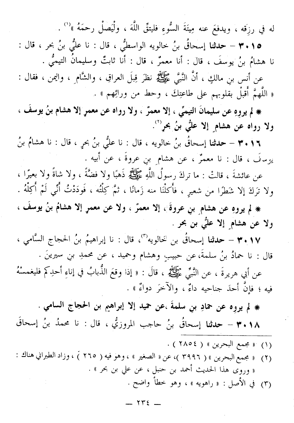 3015 - حَدَّثَنَا إِسْحَاقُ بْنُ خَالَوَيْهِ الْوَاسِطِيُّ قَالَ: نا عَلِيُّ بْنُ بَحْرٍ قَالَ: نا هِشَامُ بْنُ يُوسُفَ قَالَ: أَنَا مَعْمَرٌ قَالَ: أَنَا ثَابِتٌ، وَسُلَيْمَانُ التَّيْمِيُّ، عَنْ أَنَسِ بْنِ مَالِكٍ، أَنَّ النَّبِيَّ صَلَّى اللهُ عَلَيْهِ وَسَلَّمَ نَظَرَ قِبَلَ الْعِرَاقِ، وَالشَّامِ، وَالْيَمَنِ، فَقَالَ: «§اللَّهُمَّ أَقْبِلْ بِقُلُوبِهِمْ عَلَى طَاعَتِكَ، وَحُطَّ مِنْ وَرَائِهِمْ»
