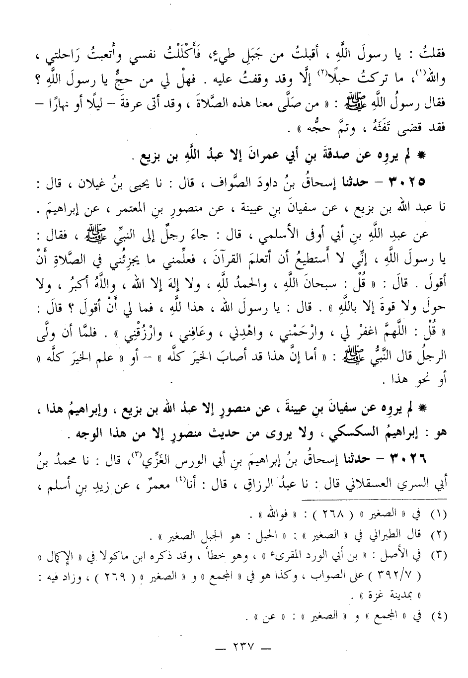 3025 - حَدَّثَنَا إِسْحَاقُ بْنُ دَاوُدَ الصَّوَّافُ قَالَ: نا يَحْيَى بْنُ غَيْلَانَ قَالَ: نا عَبْدُ اللَّهِ بْنُ بَزِيعٍ، عَنْ سُفْيَانَ بْنِ عُيَيْنَةَ، عَنْ مَنْصُورِ بْنِ الْمُعْتَمِرِ، عَنْ إِبْرَاهِيمَ، عَنْ عَبْدِ اللَّهِ بْنِ أَبِي أَوْفَى الْأَسْلَمِيِّ قَالَ: جَاءَ رَجُلٌ إِلَى النَّبِيِّ صَلَّى اللهُ عَلَيْهِ وَسَلَّمَ فَقَالَ: يَا رَسُولَ اللَّهِ، إِنِّي لَا أَسْتَطِيعُ أَنْ أَتَعَلَّمَ الْقُرْآنَ، فَعَلِّمْنِي مَا يُجْزِئُنِي فِي الصَّلَاةِ أَنْ أَقُولَ قَالَ: §قُلْ سُبْحَانَ اللَّهِ، وَالْحَمْدُ لِلَّهِ، وَلَا إِلَهَ إِلَّا اللَّهُ، وَاللَّهُ أَكْبَرُ، وَلَا حَوْلَ وَلَا قُوَّةَ إِلَّا بِاللَّهِ «قَالَ: يَا رَسُولَ اللَّهِ، هَذَا لِلَّهِ، فَمَا لِي أَنْ أَقُولَ؟ قَالَ:» قُلْ: اللَّهُمَّ اغْفِرْ لِي، وَارْحَمْنِي، وَاهْدِنِي، وَعَافِنِي، وَارْزُقْنِي «. فَلَمَّا أَنْ وَلَّى الرَّجُلُ قَالَ النَّبِيُّ صَلَّى اللهُ عَلَيْهِ وَسَلَّمَ:» أَمَا إِنَّ هَذَا قَدْ أَصَابَ الْخَيْرَ كُلَّهُ «أَوْ» عَلِمَ الْخَيْرَ كُلَّهُ " أَوْ نَحْوَ هَذَا لَمْ يَرْوِهِ عَنْ سُفْيَانَ بْنِ عُيَيْنَةَ، عَنْ مَنْصُورٍ إِلَّا عَبْدُ اللَّهِ بْنُ بَزِيعٍ، وَإِبْرَاهِيمُ هَذَا، هُوَ: إِبْرَاهِيمُ السَّكْسَكِيُّ، وَلَا يُرْوَى مِنْ حَدِيثِ مَنْصُورٍ إِلَّا مِنْ هَذَا الْوَجْهِ