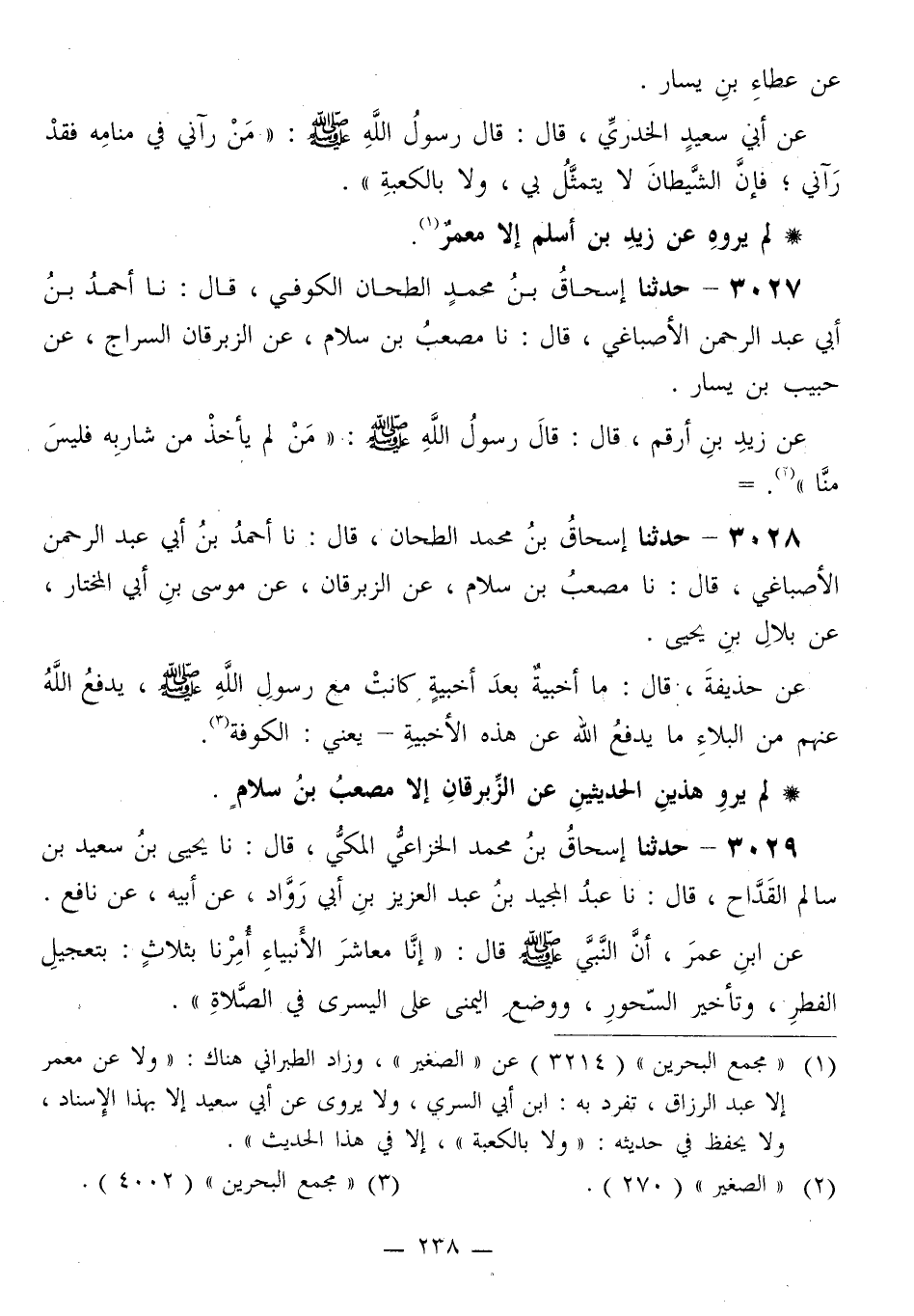 3027 - حَدَّثَنَا إِسْحَاقُ بْنُ مُحَمَّدٍ الطَّحَّانُ الْكُوفِيُّ قَالَ: نا أَحْمَدُ بْنُ أَبِي عَبْدِ الرَّحْمَنِ الْأَصْبَاغِيُّ قَالَ: نا مُصْعَبُ بْنُ سَلَّامٍ، عَنِ الزِّبْرِقَانِ السَّرَّاجِ، عَنْ حَبِيبِ بْنِ يَسَارٍ، عَنْ زَيْدِ بْنِ أَرْقَمَ قَالَ: قَالَ رَسُولُ اللَّهِ صَلَّى اللهُ عَلَيْهِ وَسَلَّمَ: «§مَنْ لَمْ يَأْخُذْ مِنْ شَارِبِهِ فَلَيْسَ مِنَّا»