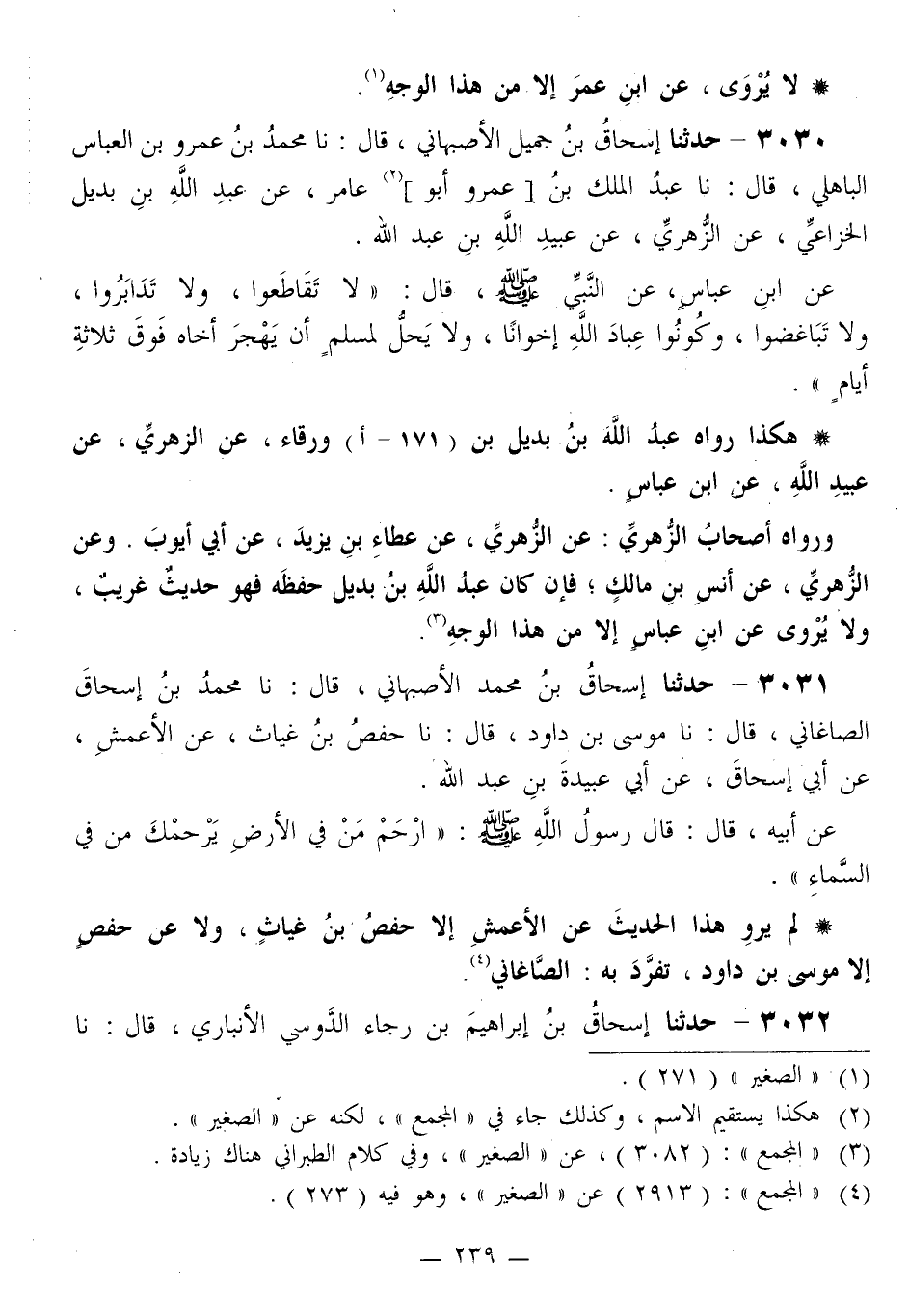 3030 - حَدَّثَنَا إِسْحَاقُ بْنُ جَمِيلٍ الْأَصْبَهَانِيُّ قَالَ: نا مُحَمَّدُ بْنُ عَمْرِو بْنِ الْعَبَّاسِ الْبَاهِلِيُّ قَالَ: نا عَبْدُ الْمَلِكِ بْنُ عَمْرٍو أَبُو عَامِرٍ، عَنْ عَبْدِ اللَّهِ بْنِ بُدَيْلٍ الْخُزَاعِيِّ، عَنِ الزُّهْرِيِّ، عَنْ عُبَيْدِ اللَّهِ بْنِ عَبْدِ اللَّهِ، عَنِ ابْنِ عَبَّاسٍ، عَنِ النَّبِيِّ صَلَّى اللهُ عَلَيْهِ وَسَلَّمَ قَالَ: «§لَا تَقَاطَعُوا، وَلَا تَدَابَرُوا، وَلَا تَبَاغَضُوا، وَكُونُوا عِبَادَ اللَّهِ إِخْوَانًا، وَلَا يَحِلُّ لِمُسْلِمٍ أَنْ يَهْجُرَ أَخَاهُ فَوْقَ ثَلَاثَةِ أَيَّامٍ» هَكَذَا رَوَاهُ عَبْدُ اللَّهِ بْنُ بُدَيْلِ بْنِ وَرْقَاءَ، عَنِ الزُّهْرِيِّ، عَنْ عُبَيْدِ اللَّهِ، عَنِ ابْنِ عَبَّاسٍ، وَرَوَاهُ أَصْحَابُ الزُّهْرِيِّ، عَنِ الزُّهْرِيِّ، عَنْ عَطَاءِ بْنِ يَزِيدَ، عَنْ أَبِي أَيُّوبَ، وَعَنِ الزُّهْرِيِّ، عَنْ أَنَسِ بْنِ مَالِكٍ فَإِنْ كَانَ عَبْدُ اللَّهِ بْنُ بُدَيْلٍ حَفِظَهُ فَهُوَ حَدِيثٌ غَرِيبٌ وَلَا يُرْوَى عَنِ ابْنِ عَبَّاسٍ إِلَّا مِنْ هَذَا الْوَجْهِ