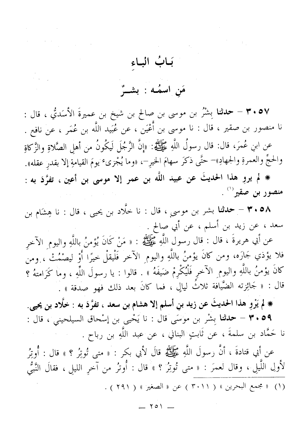 3058 - حَدَّثَنَا بِشْرُ بْنُ مُوسَى قَالَ: نا خَلَّادُ بْنُ يَحْيَى قَالَ: نا هِشَامُ بْنُ سَعْدٍ، عَنْ زَيْدِ بْنِ أَسْلَمَ، عَنْ أَبِي صَالِحٍ، عَنْ أَبِي هُرَيْرَةَ قَالَ: قَالَ رَسُولُ اللَّهِ صَلَّى اللهُ عَلَيْهِ وَسَلَّمَ: «§مَنْ كَانَ يُؤْمِنُ بِاللَّهِ وَالْيَوْمِ الْآخِرِ فَلَا يُؤْذِ جَارَهُ، وَمَنْ كَانَ يُؤْمِنُ بِاللَّهِ وَالْيَومِ الْآخِرِ فَلْيَقُلْ خَيْرًا أَوْ لِيَصْمُتْ، وَمَنْ كَانَ يُؤْمِنُ بِاللَّهِ وَالْيَوْمِ الْآخِرِ فَلْيُكْرِمْ ضَيْفَهُ» . قَالُوا: يَا رَسُولَ اللَّهِ، وَمَا كَرَامَتُهُ؟ قَالَ: «جَائِزَتُهُ الضِّيَافَةُ ثَلَاثَ لَيَالٍ، فَمَا كَانَ بَعْدَ ذَلِكَ فَهُوَ صَدَقَةٌ»
