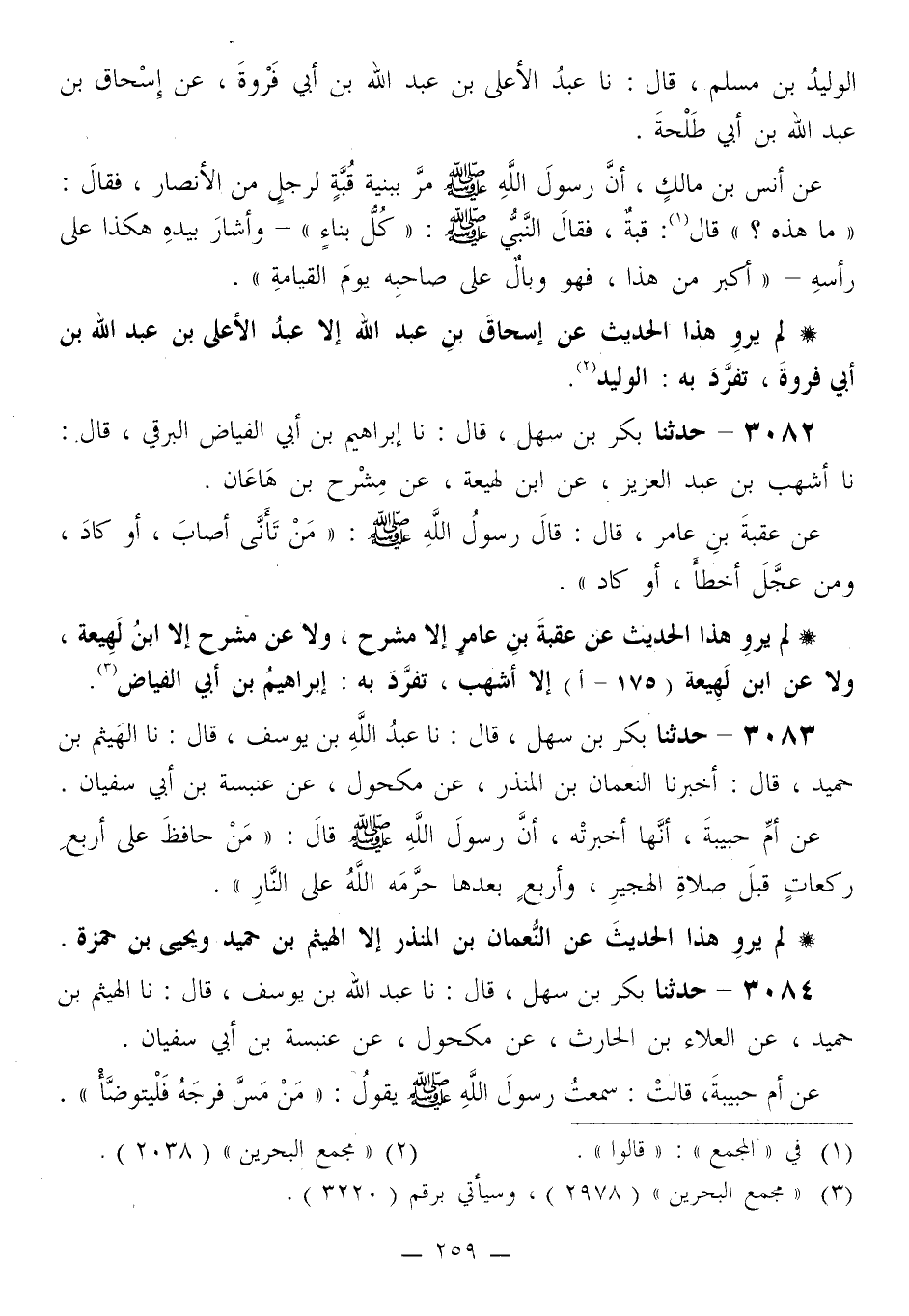 3083 - حَدَّثَنَا بَكْرُ بْنُ سَهْلٍ قَالَ: نا عَبْدُ اللَّهِ بْنُ يُوسُفَ قَالَ: نا الْهَيْثَمُ بْنُ حُمَيْدٍ قَالَ: أَخْبَرَنَا النُّعْمَانُ بْنُ الْمُنْذِرِ، عَنْ مَكْحُولٍ، عَنْ عَنبَسَةَ بْنِ أَبِي سُفْيَانَ، عَنْ أُمِّ حَبِيبَةَ أَنَّهَا أَخْبَرَتْهُ، أَنَّ رَسُولَ اللَّهِ صَلَّى اللهُ عَلَيْهِ وَسَلَّمَ قَالَ: «§مَنْ حَافَظَ عَلَى أَرْبَعِ رَكَعَاتٍ قَبْلَ صَلَاةِ الْهَجِيرِ، وَأَرْبَعٍ بَعْدَهَا حَرَّمَهُ اللَّهُ عَلَى النَّارِ»
