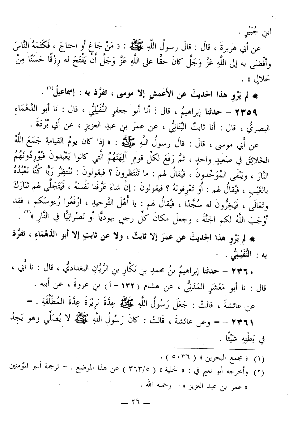 2359 - حَدَّثَنَا إِبْرَاهِيمُ قَالَ: أََنَا أَبُو جَعْفَرٍ النُّفَيْلِيُّ قَالَ: نا أَبُو الدَّهْمَاءِ الْبَصْرِيُّ قَالَ: أَنَا ثَابِتٌ الْبُنَانِيُّ، عَنْ عُمَرَ بْنِ عَبْدِ الْعَزِيزِ، عَنْ أَبِي بُرْدَةَ، عَنْ أَبِي مُوسَى قَالَ: قَالَ رَسُولُ اللَّهِ صَلَّى اللهُ عَلَيْهِ وَسَلَّمَ: «§إِذَا كَانَ يَوْمُ الْقِيَامَةِ جَمَعَ اللَّهُ الْخَلَائِقَ فِي صَعِيدٍ وَاحِدٍ، ثُمَّ رَفَعَ لِكُلِّ قَوْمٍ آلِهَتَهُمُ الَّتِي كَانُوا يَعْبُدُونَ فَيُورِدُونَهُمُ النَّارَ، وَيَبْقَى الْمُوَحِّدُونَ، فَيُقَالَ لَهُمْ: مَا تَنْتَظِرُونَ؟ فَيَقُولُونَ: نَنْتَظِرُ رَبًّا كُنَّا نَعْبُدُهُ بِالْغَيْبِ، فَيُقَالُ لَهُمْ: أَوَتَعْرِفُونَهُ؟ فَيَقُولُونَ: إِنْ شَاءَ عَرَّفَنَا نَفْسَهُ، فَيَتَجَلَّى لَهُمْ تَبَارَكَ وَتَعَالَى، فَيَخِرُّونَ لَهُ سُجَّدًا، فَيُقَالُ لَهُمْ: يَا أَهْلَ التَّوْحِيدِ، ارْفَعُوا رُءُوسَكُمْ، فَقَدْ أَوْجَبَ اللَّهُ لَكُمُ الْجَنَّةَ، وَجَعَلَ مَكَانَ كُلِّ رَجُلٍ يَهُودِيًّا أَوْ نَصْرَانِيًّا فِي النَّارِ»