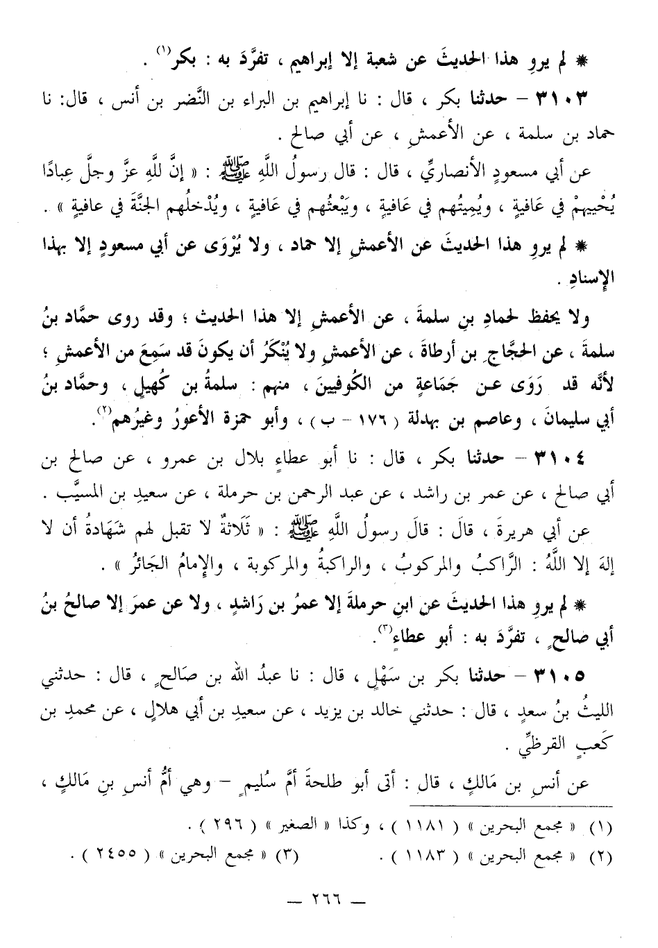 3103 - حَدَّثَنَا بَكْرٌ قَالَ: نا إِبْرَاهِيمُ بْنُ الْبَرَاءِ بْنِ النَّضْرِ بْنِ أَنَسٍ قَالَ: نا حَمَّادُ بْنُ سَلَمَةَ، عَنِ الْأَعْمَشِ، عَنْ أَبِي صَالِحٍ، عَنْ أَبِي مَسْعُودٍ الْأَنْصَارِيِّ قَالَ: قَالَ رَسُولُ اللَّهِ صَلَّى اللهُ عَلَيْهِ وَسَلَّمَ: «إِنَّ §لِلَّهِ عَزَّ وَجَلَّ عِبَادًا يُحْيِيهِمْ فِي عَافِيَةٍ، وَيُمِيتُهُمْ فِي عَافِيَةٍ، ويَبْعَثُهُمْ فِي عَافِيَةٍ، ويُدْخِلُهُمُ الْجَنَّةَ فِي عَافِيَةٍ»