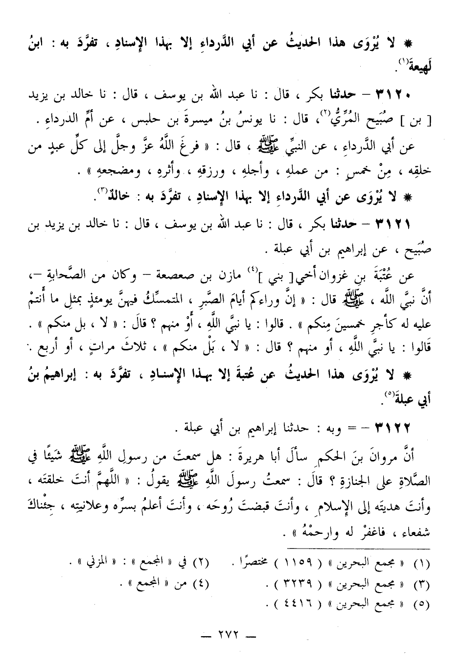 3121 - حَدَّثَنَا بَكْرٌ قَالَ: نا عَبْدُ اللَّهِ بْنُ يُوسُفَ قَالَ: نا خَالِدُ بْنُ يَزِيدَ بْنِ صُبَيْحٍ، عَنْ إِبْرَاهِيمَ بْنِ أَبِي عَبْلَةَ، عَنْ عُتْبَةَ بْنِ غَزْوَانَ، أَخِي بَنِي مَازِنِ بْنِ صَعْصَعَةَ، وَكَانَ مِنِ الصَّحَابَةِ، أَنَّ نَبِيَّ اللَّهِ صَلَّى اللهُ عَلَيْهِ وَسَلَّمَ قَالَ: «إِنَّ §وَرَاءَكُمْ أَيَّامَ الصَّبْرِ، الْمُتَمَسِّكُ فِيهِنَّ يَوْمَئِذٍ بِمِثْلِ مَا أَنْتُمْ عَلَيْهِ لَهُ كَأَجْرِ خَمْسِينَ مِنْكُمْ» ، قَالُوا: يَا نَبِيَّ اللَّهِ، أَوَمِنْهُمْ؟ قَالَ: «لَا، بَلْ مِنْكُمْ» ، قَالُوا: يَا نَبِيَّ اللَّهِ، أَوَمِنْهُمْ؟ قَالَ: «لَا، بَلْ مِنْكُمْ» ثَلَاثَ مَرَّاتٍ، أَوْ أَرْبَعًا لَا يُرْوَى هَذَا الْحَدِيثُ عَنْ عُتْبَةَ إِلَّا بِهَذَا الْإِسْنَادِ، تَفَرَّدَ بِهِ إِبْرَاهِيمُ بْنُ أَبِي عَبْلَةَ