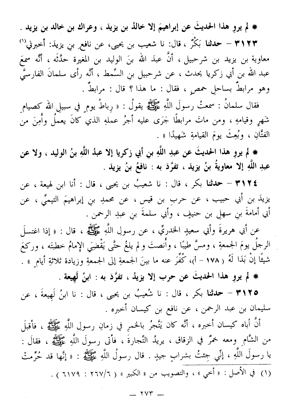 3123 - حَدَّثَنَا بَكْرٌ قَالَ: نا شُعَيْبُ بْنُ يَحْيَى، عَنْ نَافِعِ بْنِ يَزِيدَ،: أَخْبَرَنِي مُعَاوِيَةُ بْنُ يَزِيدَ بْنِ شُرَحْبِيلَ، أَنَّ عَبْدَ اللَّهِ بْنَ الْوَلِيدِ بْنِ الْمُغِيرَةِ، حَدَّثَهُ، أَنَّهُ سَمِعَ عَبْدَ اللَّهِ بْنَ أَبِي زَكَرِيَّا، يُحَدِّثُ عَنْ شُرَحْبِيلَ بْنِ السِّمْطِ، أَنَّهُ رَأَى سَلْمَانَ الْفَارِسِيَّ وَهُوَ مُرَابِطٌ بِسَاحِلِ حِمْصٍ، فَقَالَ: مَا هَذَا؟ قَالَ: مُرَابِطٌ، فَقَالَ سَلْمَانُ: سَمِعْتُ رَسُولَ اللَّهِ صَلَّى اللهُ عَلَيْهِ وَسَلَّمَ يَقُولُ: «§رِبَاطُ يَوْمٍ فِي سَبِيلِ اللَّهِ كَصِيَامِ شَهْرٍ وَقِيَامِهِ، وَمَنْ مَاتَ مُرَابِطًا جَرَى عَلَيْهِ أَجْرُ عَمَلِهِ الَّذِي كَانَ يَعْمَلُ وَأَمِنَ مِنَ الْفَتَّانِ، وَبُعِثَ يَوْمَ الْقِيَامَةِ شَهِيدًا»