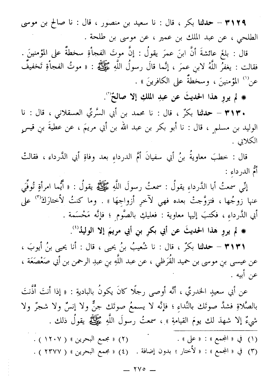 3129 - حَدَّثَنَا بَكْرٌ قَالَ: نا سَعِيدُ بْنُ مَنْصُورٍ قَالَ: نا صَالِحُ بْنُ مُوسَى الطَّلْحِيُّ، عَنْ عَبْدِ الْمَلِكِ بْنِ عُمَيْرٍ، عَنْ مُوسَى بْنِ طَلْحَةَ قَالَ: بَلَغَ عَائِشَةَ، أَنَّ ابْنَ عُمَرَ، يَقُولُ: إِنَّ مَوْتَ الْفَجْأَةِ سَخْطَةٌ عَلَى الْمُؤْمِنِينَ، فَقَالَتْ: يَغْفِرُ اللَّهُ لِابْنِ عُمَرَ، إِنَّمَا قَالَ رَسُولُ اللَّهِ صَلَّى اللهُ عَلَيْهِ وَسَلَّمَ: «§مَوْتُ الْفَجْأَةِ تَخْفِيفٌ عَنِ الْمُؤْمِنِينَ، وَسَخْطَةٌ عَلَى الْكَافِرِينَ»