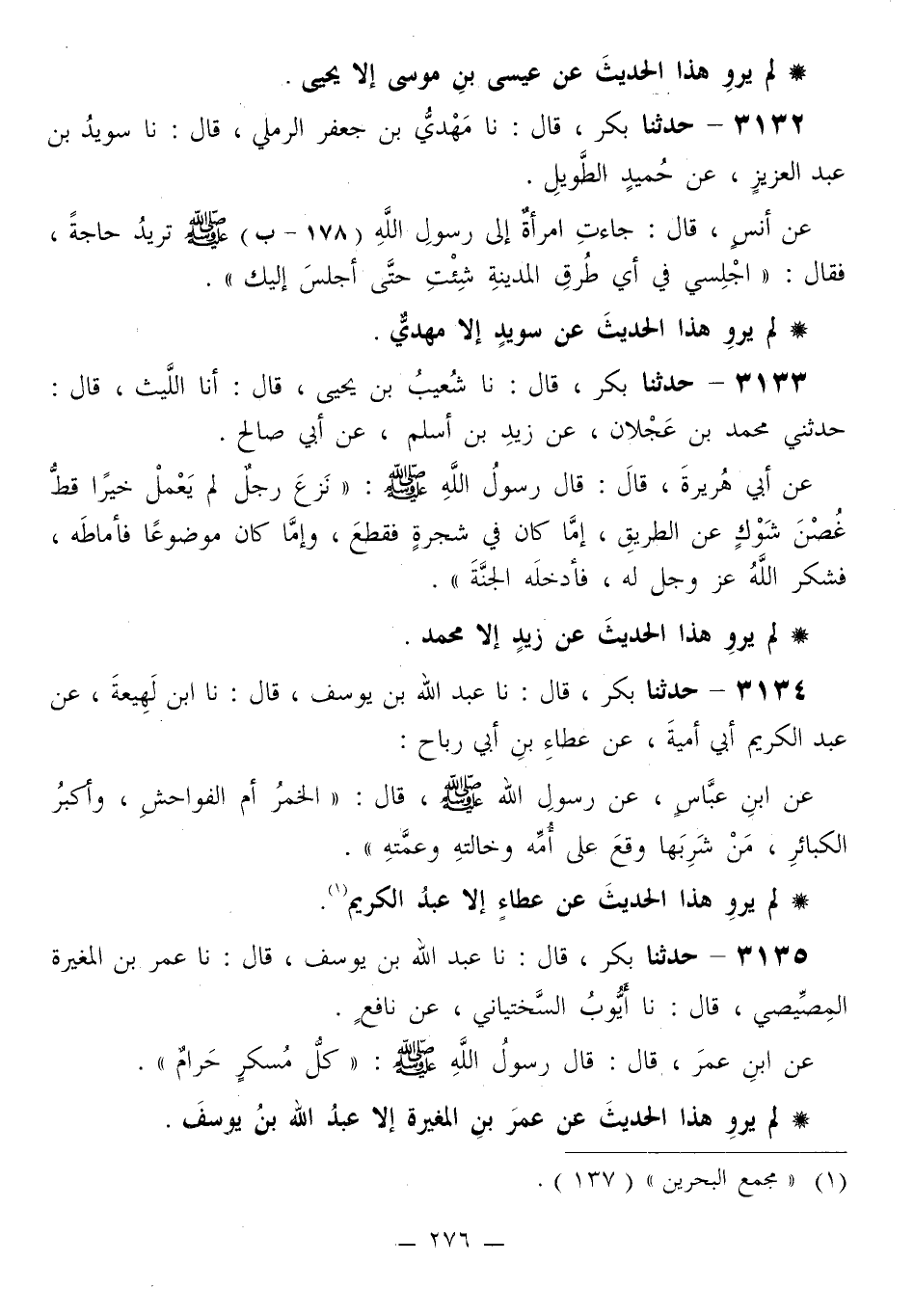 3135 - حَدَّثَنَا بَكْرٌ قَالَ: نا عَبْدُ اللَّهِ بْنُ يُوسُفَ قَالَ: نا عُمَرُ بْنُ الْمُغِيرَةِ الْمِصِّيصِيُّ قَالَ: نا أَيُّوبُ السَّخْتِيَانِيُّ، عَنْ نَافِعٍ، عَنِ ابْنِ عُمَرَ قَالَ: قَالَ رَسُولُ اللَّهِ صَلَّى اللهُ عَلَيْهِ وَسَلَّمَ: «§كُلُّ مُسْكِرٍ حَرَامٌ»
