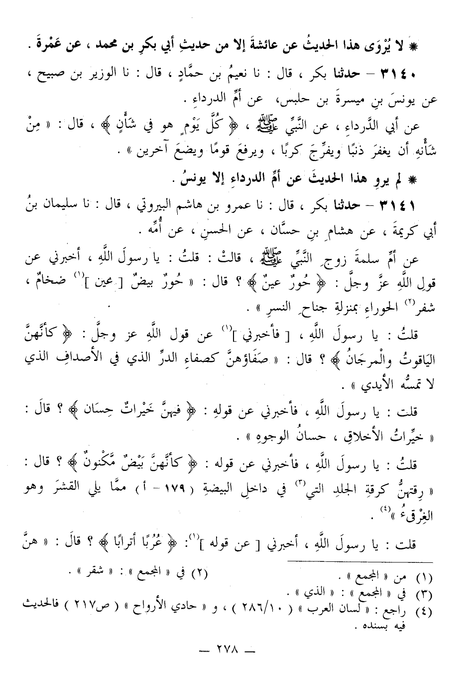 3141 - حَدَّثَنَا بَكْرٌ قَالَ: نا عَمْرُو بْنُ هَاشِمٍ الْبَيْرُوتِيُّ قَالَ: نا سُلَيْمَانُ بْنُ أَبِي كَرِيمَةَ، عَنْ هِشَامِ بْنِ حَسَّانَ، عَنِ الْحَسَنِ، عَنْ أُمِّهِ، عَنْ أُمِّ سَلَمَةَ زَوْجِ النَّبِيِّ صَلَّى اللهُ عَلَيْهِ وَسَلَّمَ قَالَتْ: قُلْتُ: يَا رَسُولَ اللَّهِ، أَخْبِرْنِي عَنْ قَوْلِ اللَّهِ عَزَّ وَجَلَّ: {حُورٌ عِينٌ} [الواقعة: 22] قَالَ: «§حُورٌ بِيضٌ، عِينٌ ضِخَامٌ، شُفْرُ الْحَوْرَاءِ بِمَنْزِلَةِ جَنَاحِ النَّسْرِ»