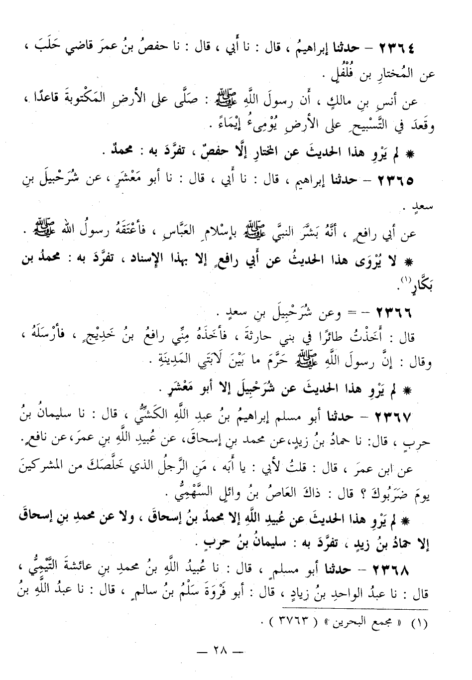 2365 - حَدَّثَنَا إِبْرَاهِيمُ قَالَ: نا أَبِي قَالَ: نا أَبُو مَعْشَرٍ، عَنْ شُرَحْبِيلَ بْنِ سَعْدٍ، عَنْ أَبِي رَافِعٍ، أَنَّهُ §بَشَّرَ النَّبِيَّ صَلَّى اللهُ عَلَيْهِ وَسَلَّمَ بِإِسْلَامِ الْعَبَّاسِ، فَأَعْتَقَهُ رَسُولُ اللَّهِ صَلَّى اللهُ عَلَيْهِ وَسَلَّمَ لَا يُرْوَى هَذَا الْحَدِيثُ عَنْ أَبِي رَافِعٍ إِلَّا بِهَذَا الْإِسْنَادِ، تَفَرَّدَ بِهِ مُحَمَّدُ بْنُ بَكَّارٍ