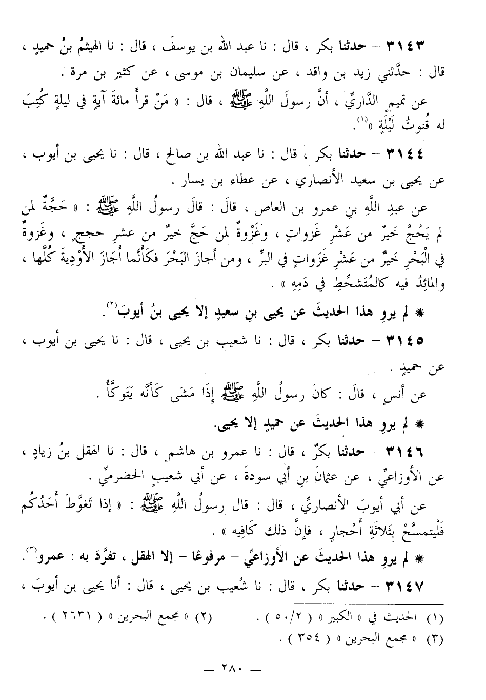3143 - حَدَّثَنَا بَكْرٌ قَالَ: نا عَبْدُ اللَّهِ بْنُ يُوسُفَ قَالَ: نا الْهَيْثَمُ بْنُ حُمَيْدٍ قَالَ: حَدَّثَنِي زَيْدُ بْنُ وَاقِدٍ، عَنْ سُلَيْمَانَ بْنِ مُوسَى، عَنْ كَثِيرِ بْنِ مُرَّةَ، عَنْ تَمِيمٍ الدَّارِيِّ، أَنَّ رَسُولَ اللَّهِ صَلَّى اللهُ عَلَيْهِ وَسَلَّمَ قَالَ: «§مَنْ قَرَأَ مِائَةَ آيَةٍ فِي لَيْلَةٍ كُتِبَ لَهُ قُنُوتُ لَيْلَةٍ»