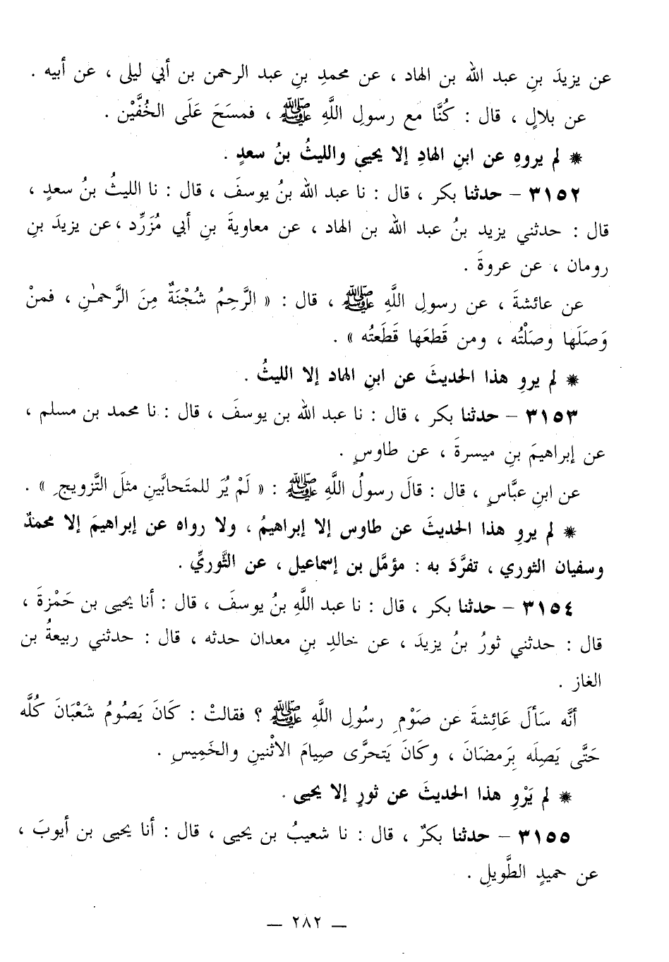 3154 - حَدَّثَنَا بَكْرٌ قَالَ: نا عَبْدُ اللَّهِ بْنُ يُوسُفَ قَالَ: أَنَا يَحْيَى بْنُ حَمْزَةَ قَالَ: حَدَّثَنِي ثَوْرُ بْنُ يَزِيدَ، عَنْ خَالِدِ بْنِ مَعْدَانَ، حَدَّثَهُ قَالَ: حَدَّثَنِي رَبِيعَةُ بْنُ الْغَازِ، أَنَّهُ سَأَلَ عَائِشَةَ عَنْ صَوْمِ رَسُولِ اللَّهِ صَلَّى اللهُ عَلَيْهِ وَسَلَّمَ فَقَالَتْ: كَانَ §يَصُومُ شَعْبَانَ كُلَّهُ حَتَّى يَصِلَهُ بِرَمَضَانَ، وَكَانَ يَتَحَرَّى صِيَامَ الِاثْنَيْنِ وَالْخَمِيسَ لَمْ يَرْوِ هَذَا الْحَدِيثَ عَنْ ثَوْرٍ إِلَّا يَحْيَى