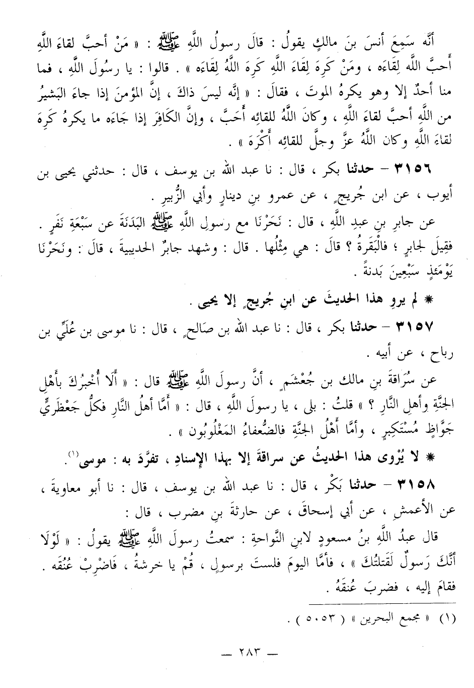 3158 - حَدَّثَنَا بَكْرٌ قَالَ: نا عَبْدُ اللَّهِ بْنُ يُوسُفَ قَالَ: نا أَبُو مُعَاوِيَةُ، عَنِ الْأَعْمَشِ، عَنْ أَبِي إِسْحَاقَ، عَنْ حَارِثَةَ بْنِ مُضَرِّبٍ قَالَ: قَالَ عَبْدُ اللَّهِ بْنُ مَسْعُودٍ لِابْنِ النَّوَّاحَةِ: سَمِعْتُ رَسُولَ اللَّهِ صَلَّى اللهُ عَلَيْهِ وَسَلَّمَ يَقُولُ: «§لَوْلَا أَنَّكَ رَسُولٌ لَقَتَلْتُكَ» فَأَمَّا الْيَوْمَ فَلَسْتَ بِرَسُولٍ، قُمْ يَا خَرَشَةُ، فَاضْرِبْ عُنُقَهُ، فَقَامَ إِلَيْهِ، فَضَرَبَ عُنُقَهُ لَمْ يَرْوِ هَذَا الْحَدِيثَ عَنِ الْأَعْمَشِ إِلَّا أَبُو مُعَاوِيَةَ