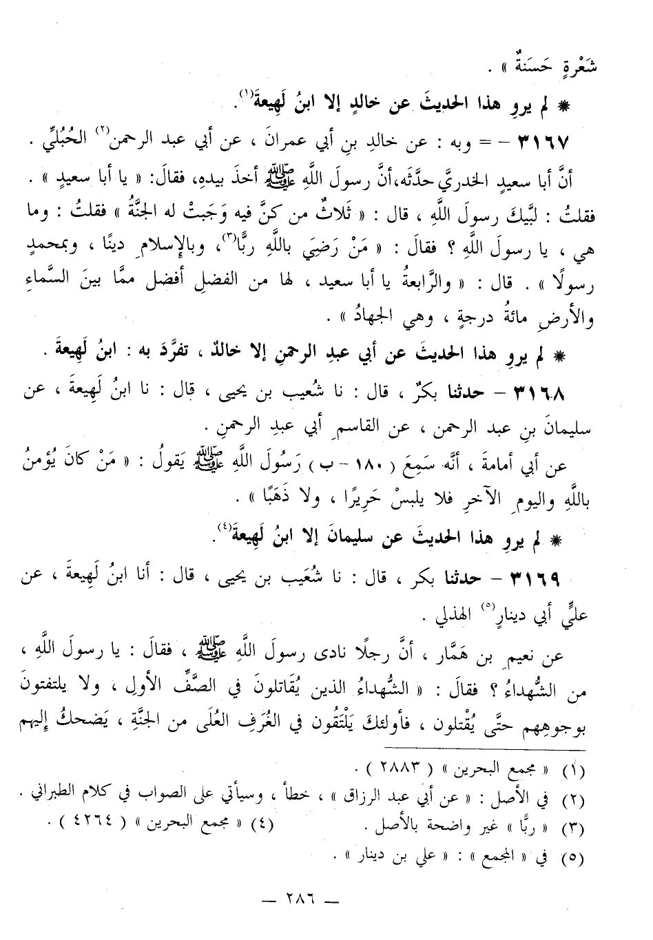 3169 - حَدَّثَنَا بَكْرٌ قَالَ: نا شُعَيْبُ بْنُ يَحْيَى قَالَ: أَنَا ابْنُ لَهِيعَةَ، عَنْ عَلِيٍّ أَبِي دِينَارٍ الْهُذَلِيِّ، عَنْ نُعَيْمِ بْنِ هَمَّارٍ، أَنَّ رَجُلًا نَادَى رَسُولَ اللَّهِ صَلَّى اللهُ عَلَيْهِ وَسَلَّمَ فَقَالَ: يَا رَسُولَ اللَّهِ، مَنِ الشُّهَدَاءُ؟ فَقَالَ: «§الشُّهَدَاءُ الَّذِينَ يُقَاتِلُونَ فِي الصَّفِّ الْأَوَّلِ، وَلَا يَلْتَفِتُونَ بِوُجُوهِهِمْ حَتَّى يُقْتَلُوا، فَأُولَئِكَ يَلْتَقُونَ فِي الْغُرَفِ الْعُلَى مِنَ الْجَنَّةِ، يَضْحَكُ إِلَيْهِمْ -[287]- رَبُّكَ، إِنَّ اللَّهَ عَزَّ وَجَلَّ إِذَا ضَحِكَ إِلَى عَبْدِهِ الْمُؤْمِنِ فَلَا حِسَابَ عَلَيْهِ»