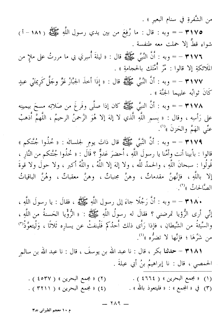 3180 - وَبِهِ أَنَّ رَجُلًا جَاءَ إِلَى رَسُولِ اللَّهِ صَلَّى اللهُ عَلَيْهِ وَسَلَّمَ، فَقَالَ: يَا رَسُولَ اللَّهِ، إِنِّي أَرَى الرُّؤْيَا تُمْرِضُنِي، فَقَالَ لَهُ رَسُولَ اللَّهِ صَلَّى اللهُ عَلَيْهِ وَسَلَّمَ: «§الرُّؤْيَا الْحَسَنَةُ مِنَ اللَّهِ، وَالسَّيِّئَةُ مِنَ الشَّيْطَانِ، فَإِذَا رَأَى ذَلِكَ أَحَدُكُمْ فَلْيَنْفِثْ عَنْ يَسَارِهِ ثَلَاثًا، وَلْيَتَعَوَّذْ مِنْ شَرِّهَا، فَإِنَّهَا لَا تَضُرُّهُ»