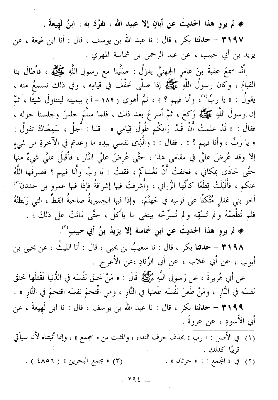 3197 - حَدَّثَنَا بَكْرٌ قَالَ: نا عَبْدُ اللَّهِ بْنُ يُوسُفَ قَالَ: أَنَا ابْنُ لَهِيعَةَ، عَنْ يَزِيدَ بْنِ أَبِي حَبِيبٍ، عَنْ عَبْدِ الرَّحْمَنِ بْنِ شِمَاسَةَ الْمَهْرِيِّ، أَنَّهُ سَمِعَ عُقْبَةَ بْنَ عَامِرٍ الْجُهَنِيِّ يَقُولُ: صَلَّيْنَا مَعَ رَسُولِ اللَّهِ صَلَّى اللهُ عَلَيْهِ وَسَلَّمَ، فَأَطَالَ بِنَا الْقِيَامَ، وَكَانَ رَسُولُ اللَّهِ صَلَّى اللهُ عَلَيْهِ وَسَلَّمَ إِذَا صَلَّى خَفَّفَ فِي قِيَامِهِ، وَفِي ذَلِكَ نَسْمَعُ مِنْهُ، يَقُولُ: «يَا رَبِّ، وَأَنَا فِيهِمْ؟» ، ثُمَّ أَهْوَى بِيَمِينِهِ لِيَتَنَاوَلَ شَيْئًا، ثُمَّ إِنَّ رَسُولَ اللَّهِ صَلَّى اللهُ عَلَيْهِ وَسَلَّمَ رَكَعَ، ثُمَّ أَسْرَعَ بَعْدَ ذَلِكَ، فَلَمَّا سَلَّمَ جَلَسَ وَجَلَسْنَا حَوْلَهُ، فَقَالَ: «قَدْ عَلِمْتُ أَنْ قَدْ رَابَكُمْ طُولُ قِيَامِي» قُلْنَا: أَجَلْ، سَمِعْنَاكَ تَقُولُ: «يَا رَبِّ، وَأَنَا فِيهِمْ؟» فَقَالَ: «وَالَّذِي نَفْسِي بِيَدِهِ §مَا وُعِدْتُمْ فِي الْآخِرَةِ مِنْ شَيْءٍ إِلَّا وَقَدْ عُرِضَ عَلَيَّ فِي مَقَامِي هَذَا، حَتَّى عُرِضَ عَلَيَّ النَّارُ، فَأَقْبَلَ عَلَيَّ شَيْءٌ مِنْهَا حَتَّى حَاذَى بِمَكَانِي، فَخِفْتُ أَنْ تَغْشَاكُمْ، فَقُلْتُ: يَا رَبِّ وَأَنَا فِيهِمْ؟ فَصَرَفَهَا اللَّهُ عَنْكُمْ، فَأَقْبَلَتْ قِطَعًا كَأَنَّهَا الزَّرَابِيُّ، وأَشْرَفْتُ فِيهَا إِشْرَافَةً فَإِذَا فِيهَا عَمْرُو بْنُ حِدْثَانَ أَخُو بَنِي غِفَارٍ مُتَّكِئًا عَلَى قَوْسِهِ فِي جَهَنَّمَ، وَإِذَا فِيهَا الْحِمْيَرِيَّةُ صَاحِبَةُ الْقِطِّ، الَّتِي رَبَطَتْهُ فَلَمْ تُطْعِمْهُ وَلَمْ تَسْقِهِ وَلَمْ تُسَرِّحْهُ يَبْتَغِي مَا يَأْكُلُ، حَتَّى مَاتَتْ عَلَى ذَلِكَ»