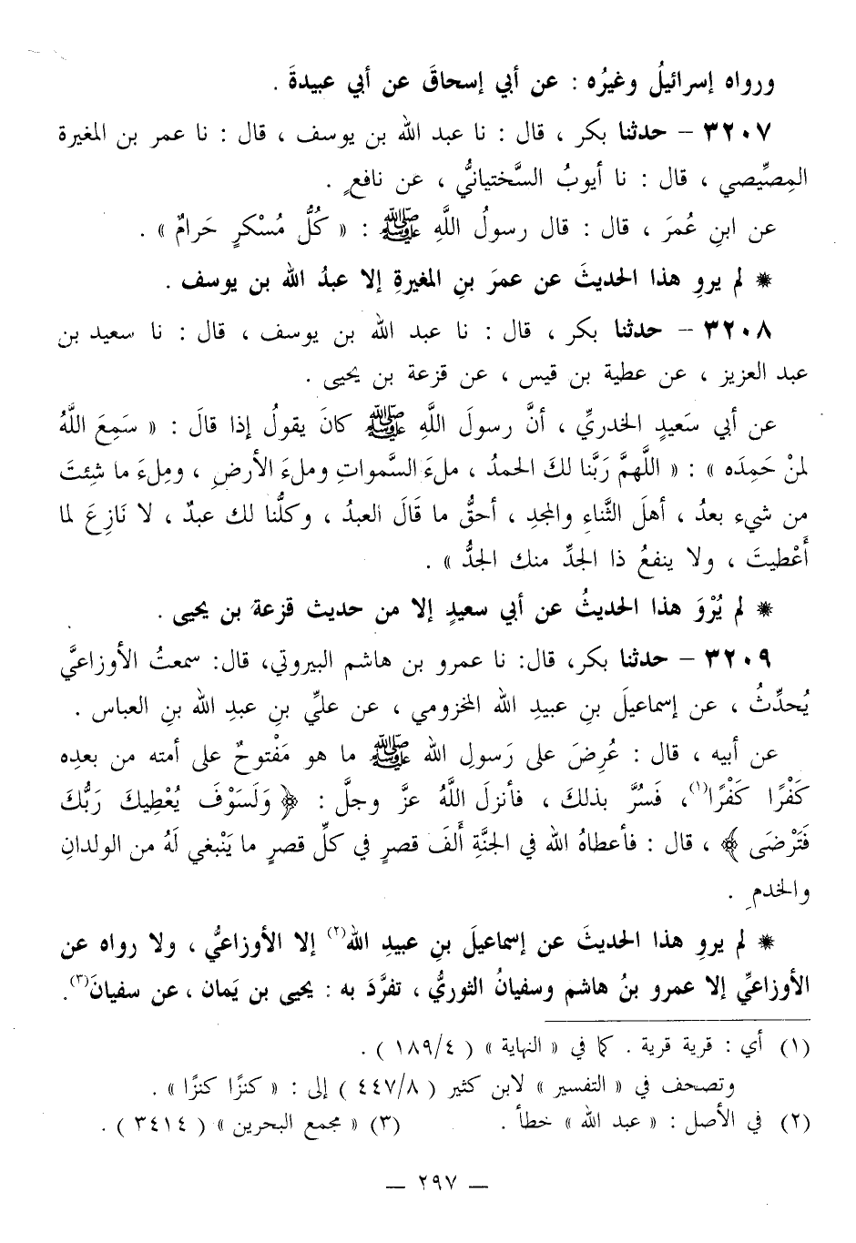 3207 - حَدَّثَنَا بَكْرٌ قَالَ: نا عَبْدُ اللَّهِ بْنُ يُوسُفَ قَالَ: نا عُمَرُ بْنُ الْمُغِيرَةِ الْمِصِّيصِيُّ قَالَ: نا أَيُّوبُ السَّخْتِيَانِيُّ، عَنْ نَافِعٍ، عَنِ ابْنِ عُمَرَ قَالَ: قَالَ رَسُولُ اللَّهِ صَلَّى اللهُ عَلَيْهِ وَسَلَّمَ: «§كُلُّ مُسْكِرٍ حَرَامٌ»