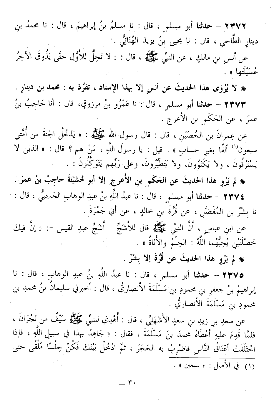 2373 - حَدَّثَنَا أَبُو مُسْلِمٍ قَالَ: نا عَمْرُو بْنُ مَرْزُوقٍ قَالَ: أَنَا حَاجِبُ بْنُ عُمَرَ، عَنِ الْحَكَمِ بْنِ الْأَعْرَجِ، عَنْ عِمْرَانَ بْنِ الْحُصَيْنِ قَالَ: قَالَ رَسُولُ اللَّهِ صَلَّى اللهُ عَلَيْهِ وَسَلَّمَ: «§يَدْخُلُ الْجَنَّةَ مِنْ أُمَّتِي سَبْعُونَ أَلْفًا بِغَيْرِ حِسَابٍ» قِيلَ: يَا رَسُولَ اللَّهِ مَنْ هُمْ؟ قَالَ: «الَّذِينَ لَا يَسْتَرِقُونَ، وَلَا يَكْتَوُونَ، وَلَا يَتَطَيَّرُونَ، وَعَلَى رَبِّهِمْ يَتَوَكَّلُونَ»