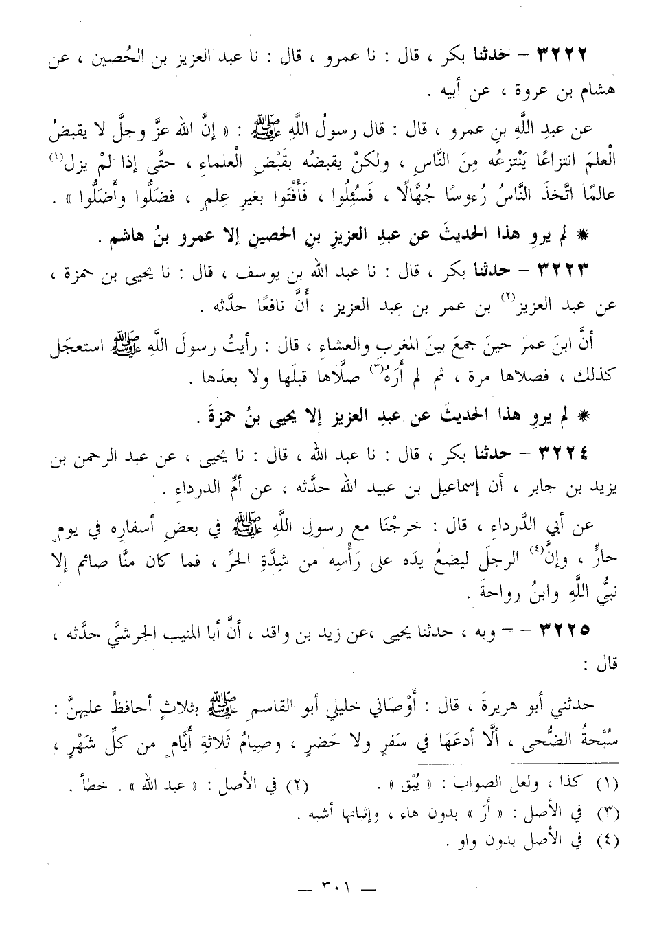 3222 - حَدَّثَنَا بَكْرٌ قَالَ: نا عَمْرٌو قَالَ: نا عَبْدُ الْعَزِيزِ بْنُ الْحُصَيْنِ، عَنْ هِشَامِ بْنِ عُرْوَةَ، عَنْ أَبِيهِ، عَنْ عَبْدِ اللَّهِ بْنِ عُمَرَ قَالَ: قَالَ رَسُولُ اللَّهِ صَلَّى اللهُ عَلَيْهِ وَسَلَّمَ: «إِنَّ §اللَّهَ عَزَّ وَجَلَّ لَا يَقْبِضُ الْعِلْمَ انْتِزَاعًا يَنْتَزِعُهُ مِنَ النَّاسِ، وَلَكِنْ يَقْبِضُهُ بِقَبْضِ الْعُلَمَاءِ، حَتَّى إِذَا لَمْ يَزَلْ عَالِمًا اتَّخَذَ النَّاسُ رُءُوسًا جُهَّالًا فَسُئِلُوا، فَأَفْتَوْا بِغَيْرِ عِلْمٍ، فَضَلُّوا وَأَضَلُّوا»