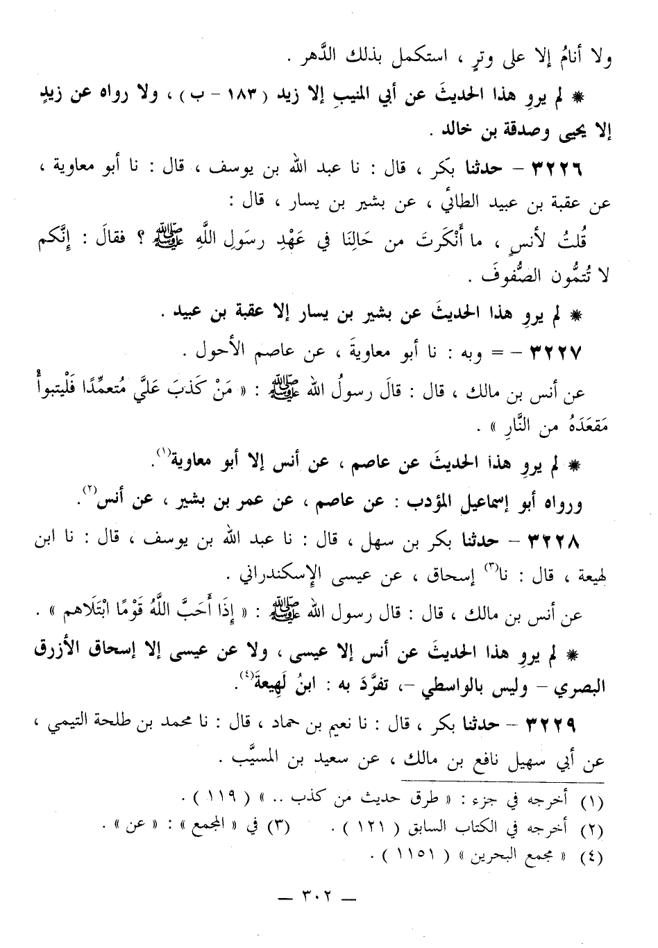 3227 - وَبِهِ نا أَبُو مُعَاوِيَةَ، عَنْ عَاصِمٍ الْأَحْوَلِ، عَنْ أَنَسِ بْنِ مَالِكٍ قَالَ: قَالَ رَسُولُ اللَّهِ صَلَّى اللهُ عَلَيْهِ وَسَلَّمَ: «§مَنْ كَذَبَ عَلَيَّ مُتَعَمِّدًا فَلْيَتَبَوَّأْ مَقْعَدَهُ مِنَ النَّارِ»