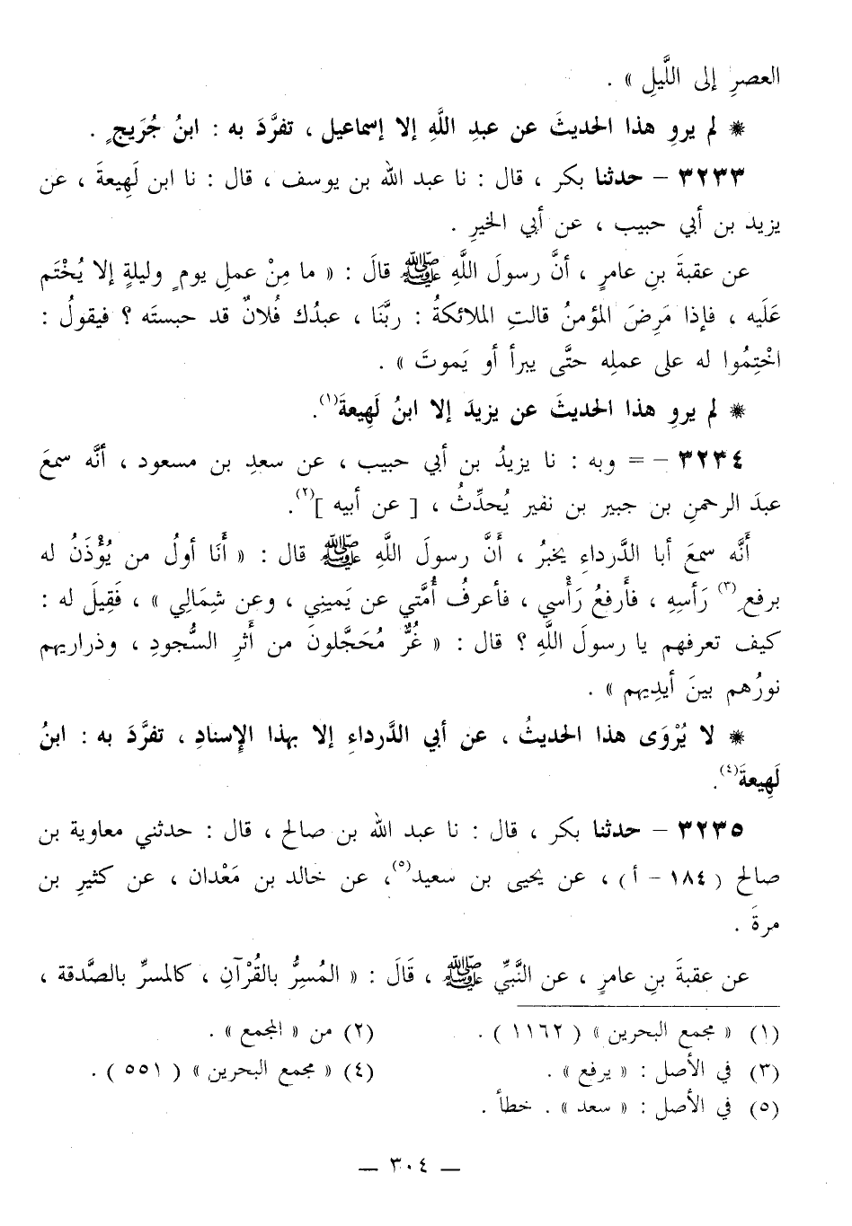 3234 - وَبِهِ نا يَزِيدُ بْنُ أَبِي حَبِيبٍ، عَنْ سَعْدِ بْنِ مَسْعُودٍ، أَنَّهُ سَمِعَ عَبْدَ الرَّحْمَنِ بْنَ جُبَيْرِ بْنِ نُفَيْرٍ يُحَدِّثُ، عَنْ أَبِيهِ، أَنَّهُ سَمِعَ أَبَا الدَّرْدَاءِ يُخْبِرُ، أَنَّ رَسُولَ اللَّهِ صَلَّى اللهُ عَلَيْهِ وَسَلَّمَ قَالَ: «§أَنَا أَوَّلُ مَنْ يُؤْذَنُ لَهُ بِرَفْعِ رَأْسِهِ، فَأَرْفَعُ رَأْسِي، فَأَعْرِفُ أُمَّتِي، عَنْ يَمِينِي، وَعَنْ شِمَالِي» ، فَقِيلَ لَهُ: كَيْفَ تَعْرِفُهُمْ يَا رَسُولَ اللَّهِ؟ قَالَ: «غُرٌّ مُحَجَّلُونَ مِنْ أَثَرِ السُّجُودِ، وَذَرَارِيُّهُمْ نُورُهُمْ بَيْنَ أَيْدِيهِمْ»