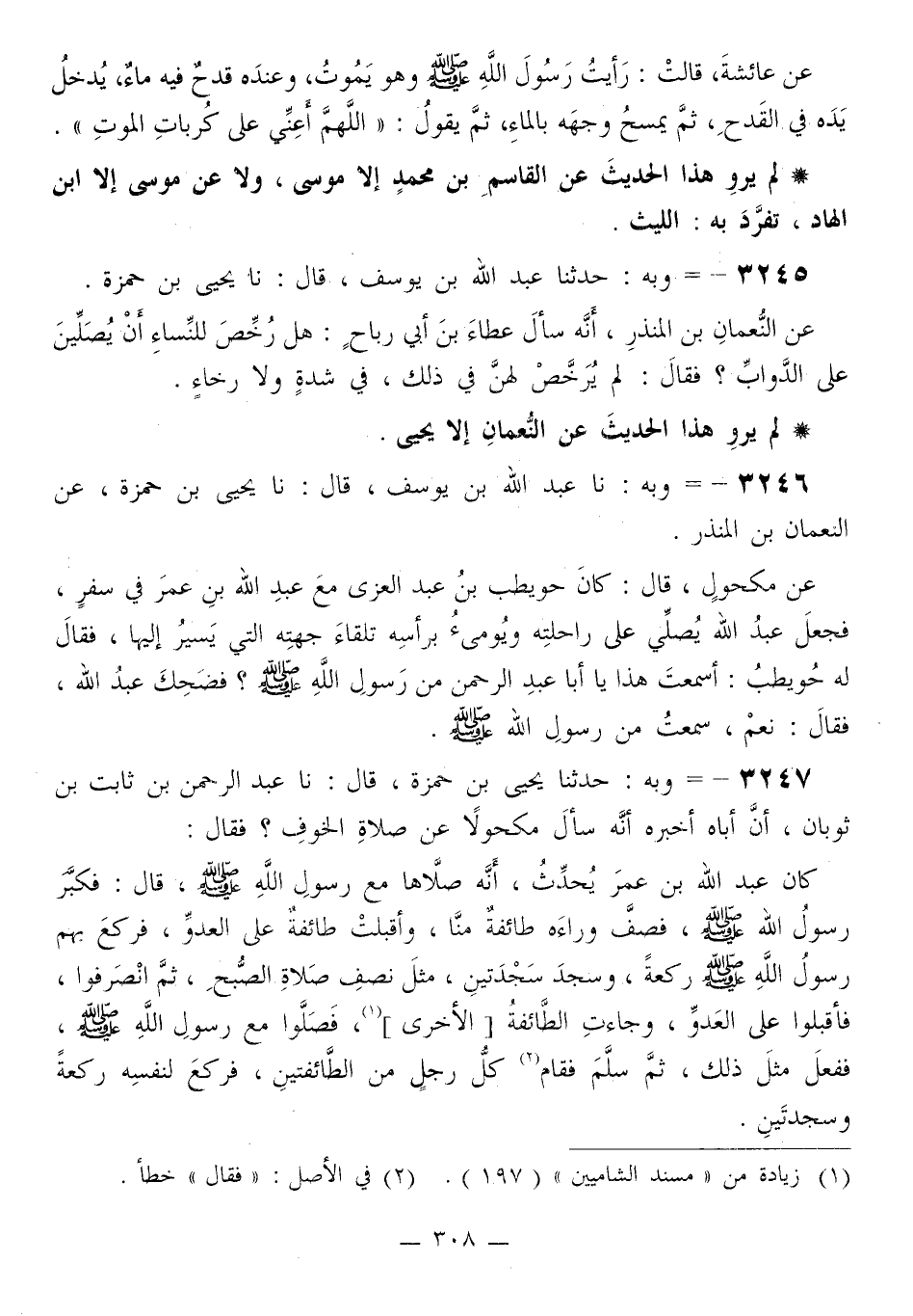 3246 - وَبِهِ نا عَبْدُ اللَّهِ بْنُ يُوسُفَ قَالَ: نا يَحْيَى بْنُ حَمْزَةَ، عَنِ النُّعْمَانِ بْنِ الْمُنْذِرِ، عَنْ مَكْحُولٍ قَالَ: كَانَ حُوَيْطِبُ بْنُ عَبْدِ الْعُزَّى مَعَ عَبْدِ اللَّهِ بْنِ عُمَرَ فِي سَفَرٍ، فَجَعَلَ عَبْدُ اللَّهِ §يُصَلِّي عَلَى رَاحِلَتِهِ وَيُومِئُ بِرَأْسِهِ تِلْقَاءَ جِهَتِهِ الَّتِي يَسِيرُ إِلَيْهَا، فَقَالَ لَهُ حُوَيْطِبٌ: أَسَمِعْتَ هَذَا يَا أَبَا عَبْدِ الرَّحْمَنِ مِنْ رَسُولِ اللَّهِ صَلَّى اللهُ عَلَيْهِ وَسَلَّمَ؟ فَضَحِكَ عَبْدُ اللَّهِ، فَقَالَ: نَعَمْ سَمِعْتُ مِنْ رَسُولِ اللَّهِ صَلَّى اللهُ عَلَيْهِ وَسَلَّمَ