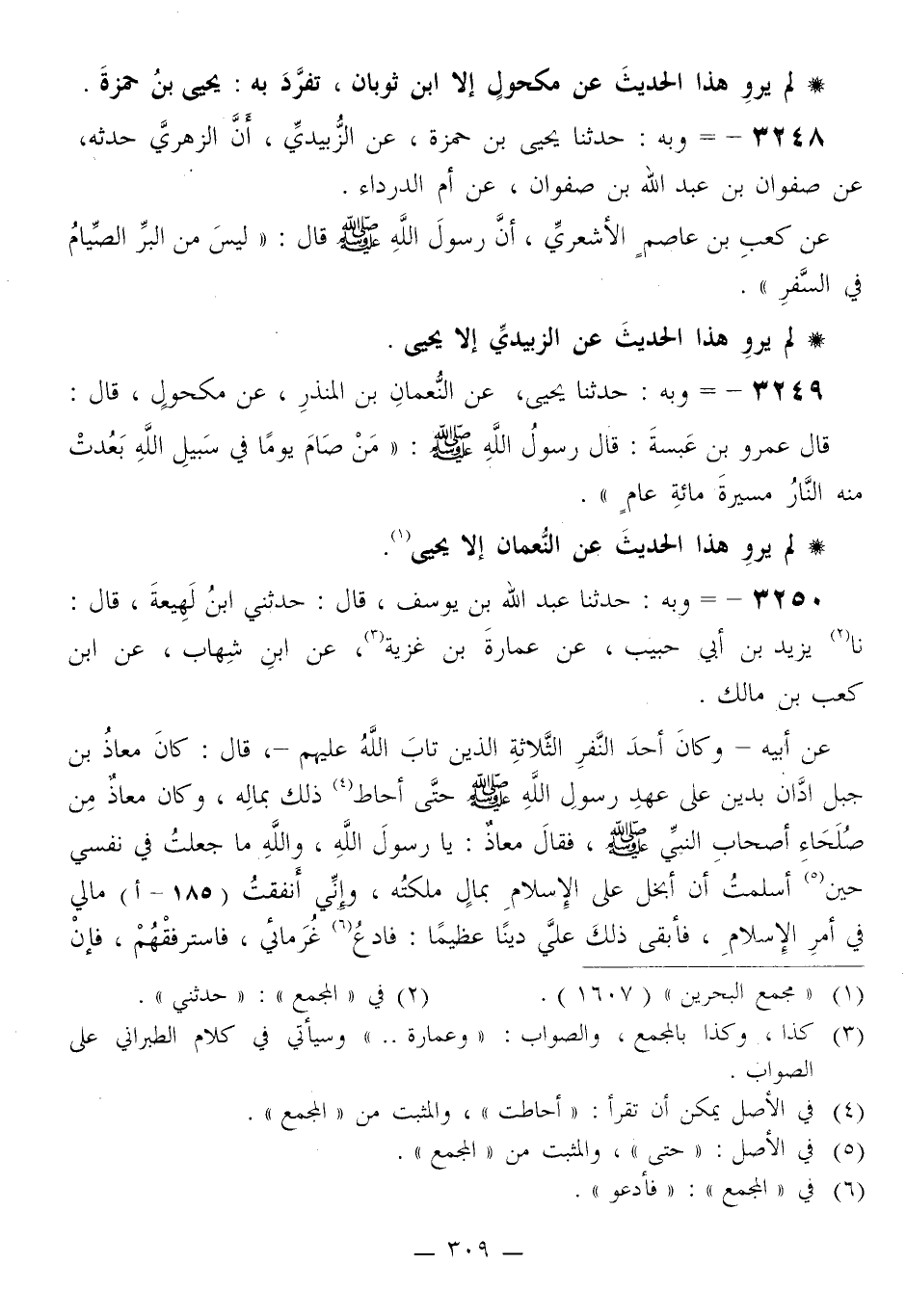 3248 - وَبِهِ حَدَّثَنَا يَحْيَى بْنُ حَمْزَةَ، عَنِ الزُّبَيْدِيِّ، أَنَّ الزُّهْرِيَّ، حَدَّثَهُ، عَنْ صَفْوَانَ بْنِ عَبْدِ اللَّهِ بْنِ صَفْوَانَ، عَنْ أُمِّ الدَّرْدَاءِ، عَنْ كَعْبِ بْنِ عَاصِمٍ الْأَشْعَرِيِّ، أَنَّ رَسُولَ اللَّهِ صَلَّى اللهُ عَلَيْهِ وَسَلَّمَ قَالَ: «§لَيْسَ مِنَ الْبِرِّ الصِّيَامُ فِي السَّفَرِ»