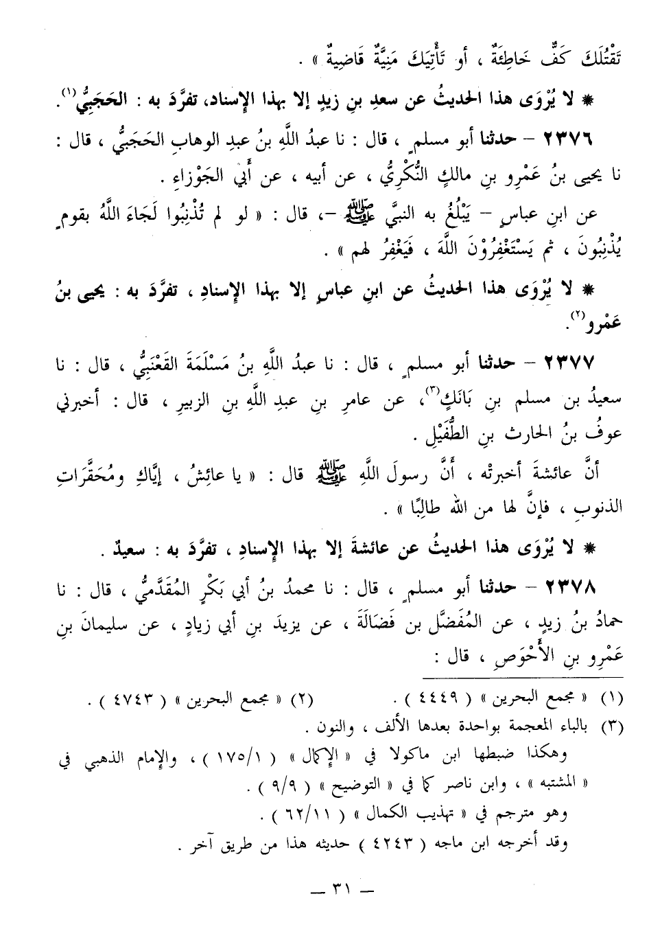 2377 - حَدَّثَنَا أَبُو مُسْلِمٍ قَالَ: نا عَبْدُ اللَّهِ بْنُ مَسْلَمَةَ الْقَعْنَبِيُّ قَالَ: نا سَعِيدُ بْنُ مُسْلِمِ بْنِ بَانَكٍ، عَنْ عَامِرِ بْنِ عَبْدِ اللَّهِ بْنِ الزُّبَيْرِ قَالَ: أَخْبَرَنِي عَوْفُ بْنُ الْحَارِثِ بْنِ الطُّفَيْلِ، أَنَّ عَائِشَةَ أَخْبَرَتْهُ، أَنَّ رَسُولَ اللَّهِ صَلَّى اللهُ عَلَيْهِ وَسَلَّمَ قَالَ: «يَا عَائِشُ، §إِيَّاكِ وَمُحَقَّرَاتِ الذُّنُوبِ، فَإِنَّ لَهَا مِنَ اللَّهِ طَالِبًا»