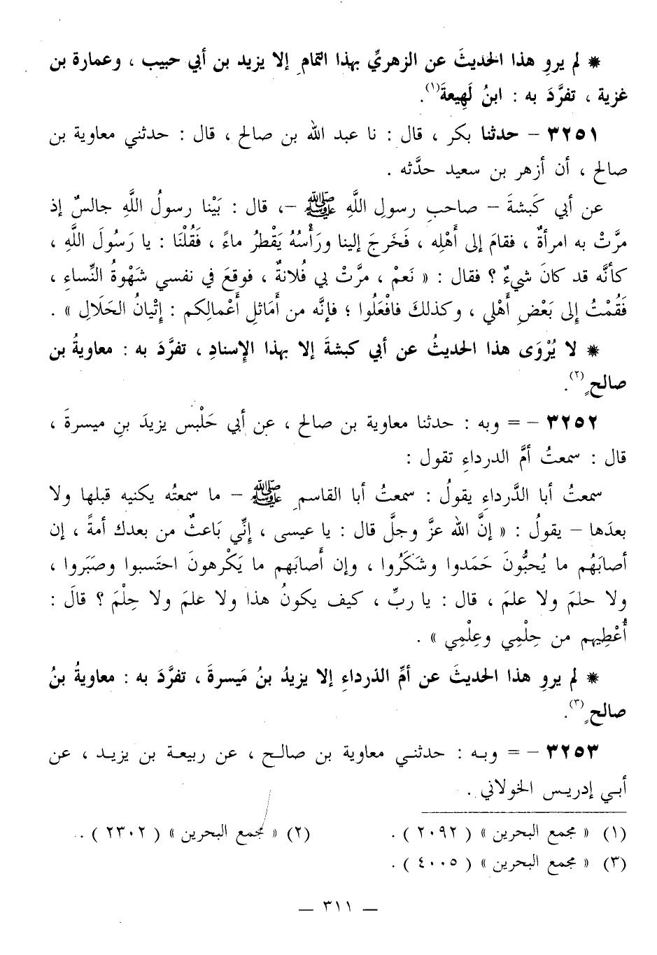 3252 - وَبِهِ حَدَّثَنَا مُعَاوِيَةُ بْنُ صَالِحٍ، عَنْ أَبِي حَلْبَسٍ يَزِيدَ بْنِ مَيْسَرَةَ قَالَ: سَمِعْتُ أُمَّ الدَّرْدَاءِ تَقُولُ: سَمِعْتُ أَبَا الدَّرْدَاءِ يَقُولُ: سَمِعْتُ أَبَا الْقَاسِمِ صَلَّى اللهُ عَلَيْهِ وَسَلَّمَ، مَا سَمِعْتُهُ يُكَنِّيهِ قَبْلَهَا وَلَا بَعْدَهَا، يَقُولُ: «إِنَّ اللَّهَ عَزَّ وَجَلَّ قَالَ: §يَا عِيسَى، إِنِّي بَاعِثٌ مِنْ بَعْدِكَ أُمَّةً، إِنْ أَصَابَهُمْ مَا يُحِبُّونَ حَمِدُوا وَشَكَرُوا، وَإِنْ أَصَابَهُمْ مَا يَكْرَهُونَ احْتَسَبُوا وَصَبَرُوا، وَلَا حِلْمَ وَلَا عِلْمَ قَالَ: يَا رَبِّ، كَيْفَ يَكُونُ هَذَا وَلَا عِلْمَ وَلَا حِلْمَ؟ قَالَ: أُعْطِيهِمْ مِنْ حِلْمِي وَعِلْمِي»