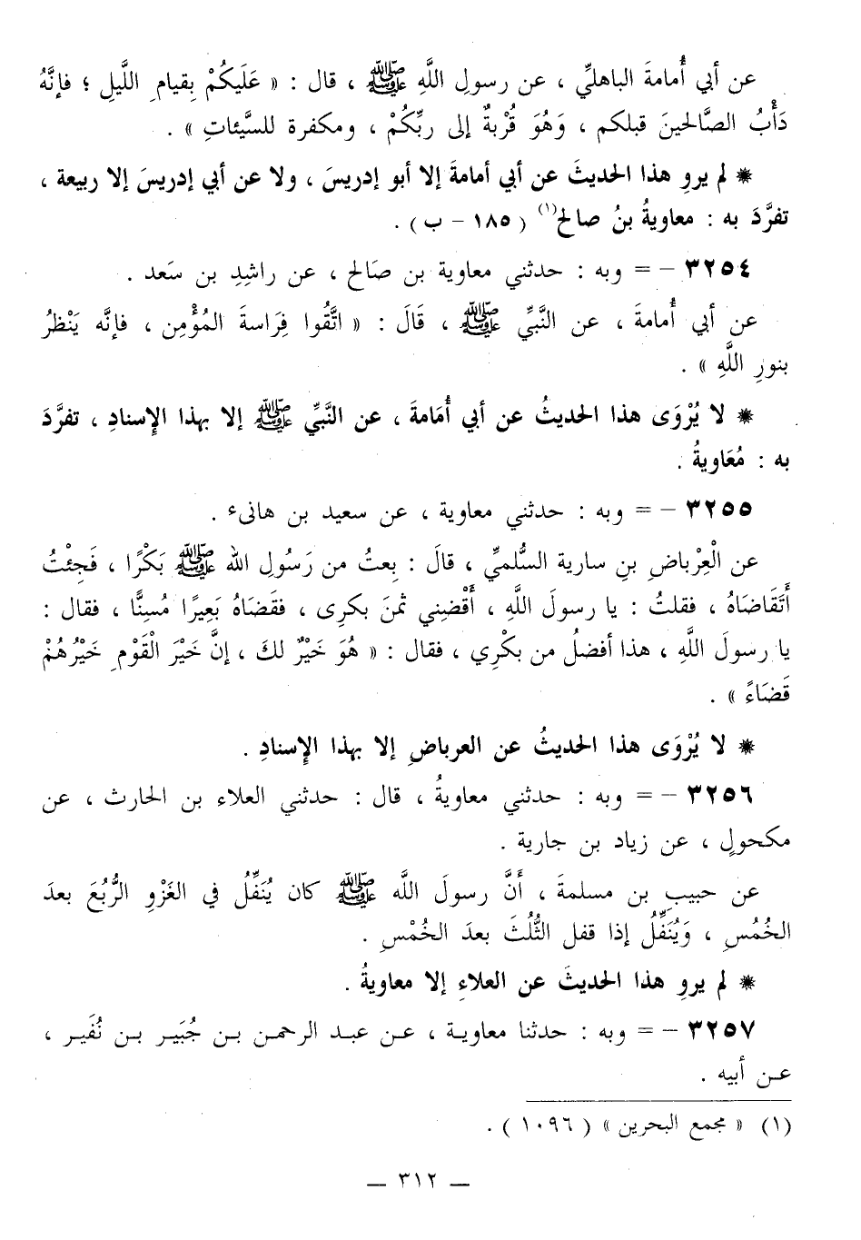 3255 - لَا يُرْوَى هَذَا الْحَدِيثُ عَنْ أَبِي أُمَامَةَ، عَنِ النَّبِيِّ صَلَّى اللهُ عَلَيْهِ وَسَلَّمَ إِلَّا بِهَذَا الْإِسْنَادِ، تَفَرَّدَ بِهِ مُعَاوِيَةُ