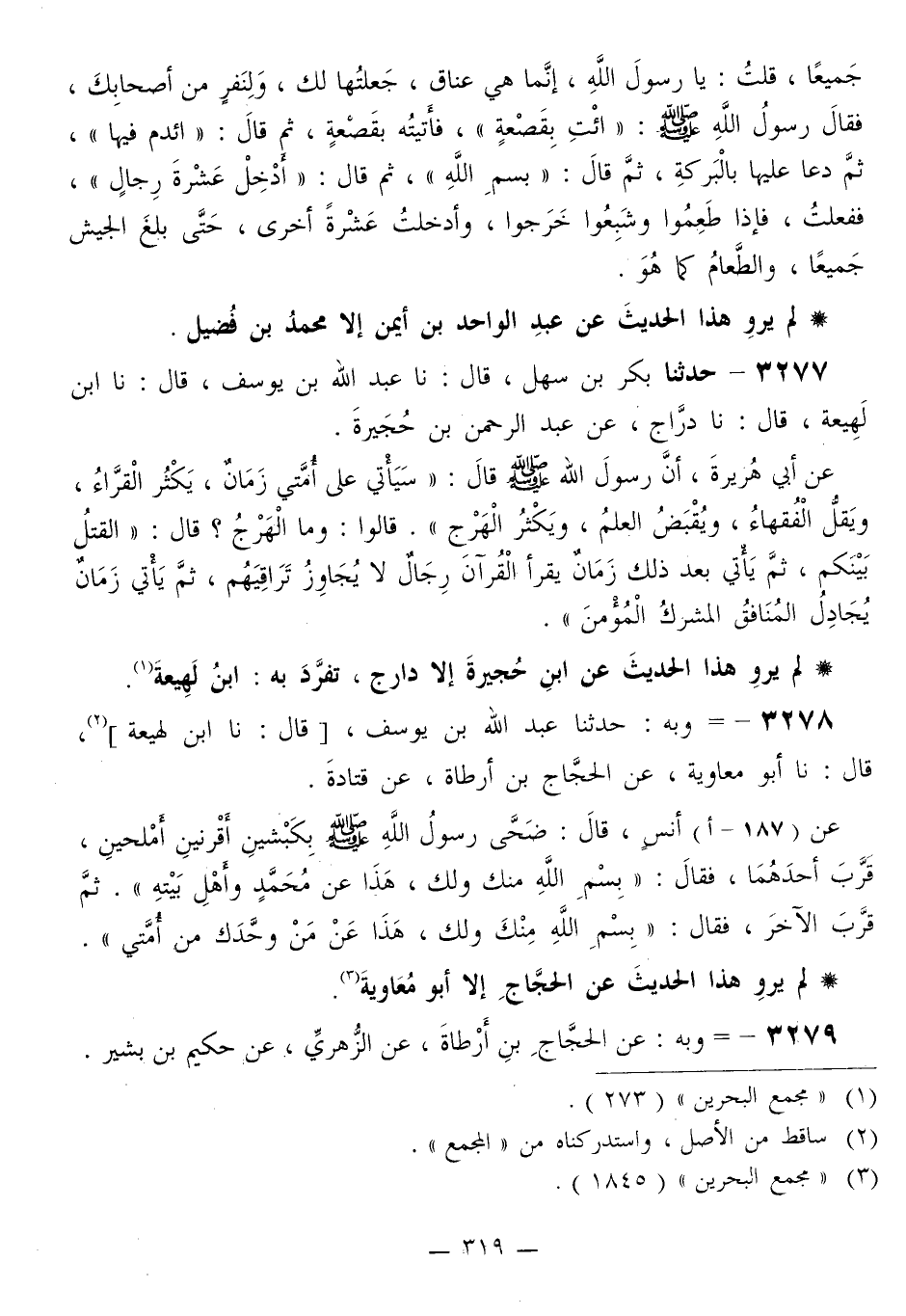 3277 - حَدَّثَنَا بَكْرُ بْنُ سَهْلٍ قَالَ: نا عَبْدُ اللَّهِ بْنُ يُوسُفَ قَالَ: نا ابْنُ لَهِيعَةَ قَالَ: نا دَرَّاجٌ، عَنْ عَبْدِ الرَّحْمَنِ بْنِ حُجَيْرَةَ، عَنْ أَبِي هُرَيْرَةَ، أَنَّ رَسُولَ اللَّهِ صَلَّى اللهُ عَلَيْهِ وَسَلَّمَ قَالَ: «§سَيَأْتِي عَلَى أُمَّتِي زَمَانٌ، يَكْثُرُ الْقُرَّاءُ، وَيَقِلُّ الْفُقَهَاءُ، وَيُقْبَضُ الْعِلْمُ، وَيَكْثُرُ الْهَرْجُ» قَالُوا: وَمَا الْهَرْجُ؟ قَالَ: «الْقَتْلُ بَيْنَكُمْ، ثُمَّ يَأْتِي بَعْدَ ذَلِكَ زَمَانٌ يَقْرَأُ الْقُرْآنَ رِجَالٌ لَا يُجَاوِزُ تَرَاقِيَهُمْ، ثُمَّ يَأْتِي زَمَانٌ يُجَادِلُ الْمُنَافِقُ الْمُشْرِكُ الْمُؤْمِنَ»