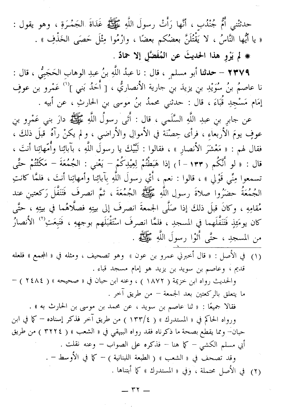 2379 - حَدَّثَنَا أَبُو مُسْلِمٍ قَالَ: نا عَبْدُ اللَّهِ بْنُ عَبْدِ الْوَهَّابِ الْحَجَبِيُّ قَالَ: نا عَاصِمُ بْنُ سُوَيْدِ بْنِ يَزِيدَ بْنِ جَارِيَةَ الْأَنْصَارِيُّ أَحَدُ بَنِي عَمْرِو بْنِ عَوْفٍ، إِمَامُ مَسْجِدِ قُبَاءَ قَالَ: حَدَّثَنِي مُحَمَّدُ بْنُ مُوسَى بْنِ الْحَارِثِ، عَنْ أَبِيهِ، عَنْ جَابِرِ بْنِ عَبْدِ اللَّهِ السُّلَمِيِّ قَالَ: أَتَى رَسُولُ اللَّهِ صَلَّى اللهُ عَلَيْهِ وَسَلَّمَ دَارَ بَنِي عَمْرِو بْنِ عَوْفٍ يَوْمَ الْأَرْبِعَاءِ، فَرَأَى حِصْنَةً فِي الْأَمْوَالِ وَالْأَرَاضِي، وَلَمْ يَكُنْ رَآهُ قَبْلَ ذَلِكَ، فَقَالَ لَهُمْ: «مَعْشَرَ الْأَنْصَارِ» فَقَالُوا: لَبَّيْكَ يَا رَسُولَ اللَّهِ، بِآبَائِنَا وَأُمَّهَاتِنَا أَنْتَ قَالَ: «لَوْ أَنَّكُمْ إِذَا هَبَطْتُمْ لِعِيدِكُمْ، يَعْنِي الْجُمُعَةَ، مَكَثْتُمْ حَتَّى تَسْمَعُوا مِنِّي قَوْلِي» قَالُوا: نَعَمْ، أَيْ رَسُولَ اللَّهِ، بِآبَائِنَا وَأُمَّهَاتِنَا أَنْتَ، فَلَمَّا كَانَتِ الْجُمُعَةُ حَضَرُوا صَلَاةَ رَسُولِ اللَّهِ صَلَّى اللهُ عَلَيْهِ وَسَلَّمَ الْجُمُعَةَ، ثُمَّ انْصَرَفَ فَتَنَفَّلَ رَكْعَتَيْنِ عِنْدَ مُقَامِهِ، وَكَانَ قَبْلَ ذَلِكَ إِذَا صَلَّى الْجُمُعَةَ انْصَرَفَ إِلَى بَيْتِهِ فَصَلَّاهُمَا فِي بَيْتِهِ، حَتَّى كَانَ يَوْمَئِذٍ فَتَنَفَّلَهُمَا فِي الْمَسْجِدِ، فَلَمَّا انْصَرَفَ اسْتَقْبَلَهُمْ بِوَجْهِهِ، فَتَبِعَتِ الْأَنْصَارُ -[33]- مِنَ الْمَسْجِدِ، حَتَّى أَتَوْا رَسُولَ اللَّهِ صَلَّى اللهُ عَلَيْهِ وَسَلَّمَ. فَقَالَ لَهُمْ رَسُولُ اللَّهِ صَلَّى اللهُ عَلَيْهِ وَسَلَّمَ: «مَعْشَرَ الْأَنْصَارِ» فَقَالُوا: لَبَّيْكَ، أَيْ رَسُولَ اللَّهِ، بِآبَائِنَا وَأُمَّهَاتِنَا أَنْتَ قَالَ: «§كُنْتُمْ فِي الْجَاهِلِيَّةِ إِذْ لَا يُعْبَدُ اللَّهُ، تَحْمِلُونَ الْكَلَّ فِي أَمْوَالِكُمْ، وَتَفْعَلُونَ الْمَعْرُوفَ، وَتُصَلُّونَ، حَتَّى إِذَا مَنَّ اللَّهُ عَلَيْكُمْ بِالْإِسْلَامِ وَأَتَى مُحَمَّدٌ صَلَّى اللهُ عَلَيْهِ وَسَلَّمَ إِذَا أَنْتُمْ تُحْصِنُونَ، فِيمَا يَأْكُلُ ابْنُ آدَمَ أَجْرٌ، وَفِيمَا يَأْكُلُ الطَّيْرُ أَجْرٌ، وَفِيمَا يَأْكُلُ السَّبُعُ أَجْرٌ» فَانْصَرَفَ الْقَوْمُ، فَمَا بَقِيَ أَحَدٌ إِلَّا هَدَمَ فِي مَالِهِ ثَلْمَتَيْنِ أَوْ ثَلَاثًا، يَعْنِي هَدَمَ فِي حِيطَانِ بَسَاتِينِهِمْ، لَيَدْخُلَ الْفُقَرَاءُ فَيَأْكُلوا مِنَ التَّمْرِ لَا يُرْوَى هَذَا الْحَدِيثُ عَنْ جَابِرٍ إِلَّا بِهَذَا الْإِسْنَادِ، تَفَرَّدَ بِهِ الْحَجَبِيُّ
